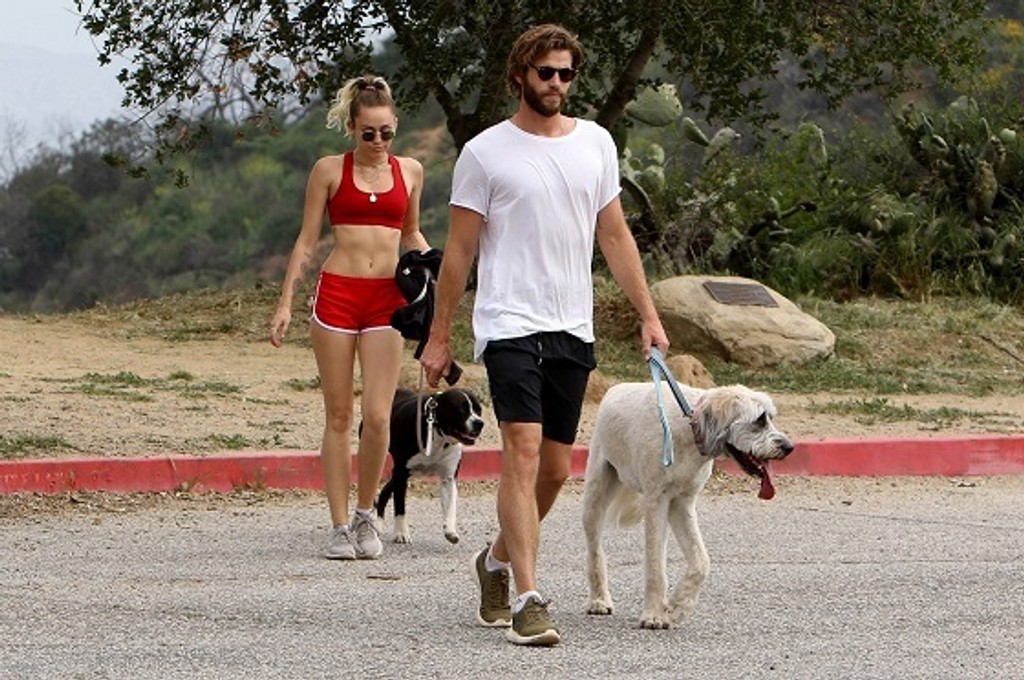 Spoločnosť im robili ich psy Mary Jane a Dora. Miley dáva svojmu telu očividne zabrať. V červenej športovej podprsenke a šortkách ukázala ploché bruško.