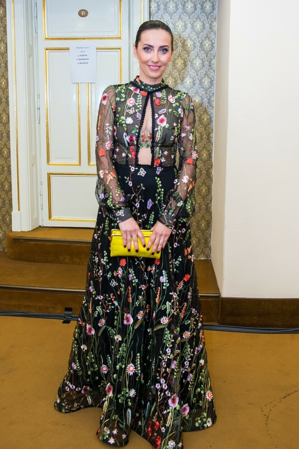 Manželka zosnulej hokejovej legendy a matka dvoch detí vyzerala úžasne. Na galavečer zvolila čierne šaty s kvetinovou výšivkou a hlbokým výstrihom. Šaty pochádzajú z dielne slovenskej návrhárky Jany Pištejovej.