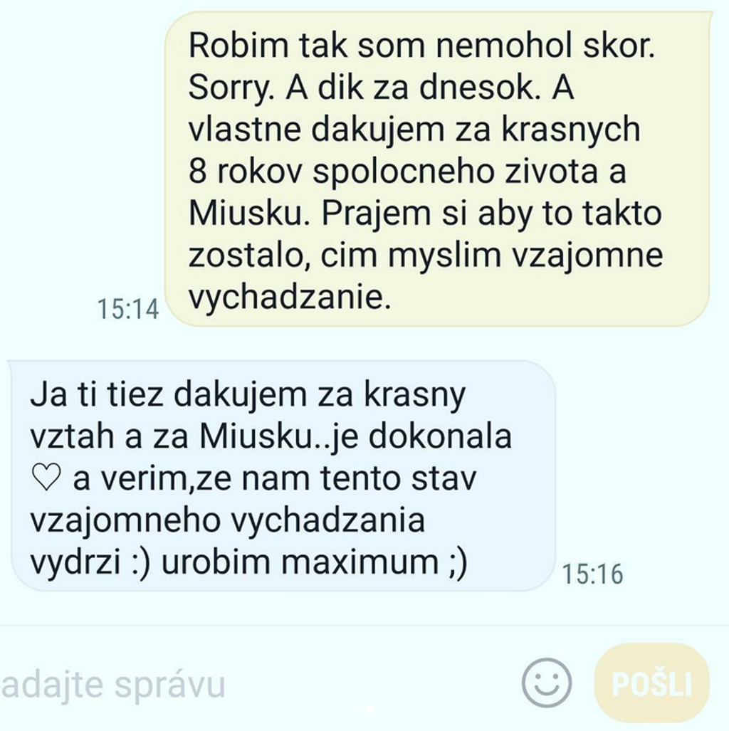 V prejave vzájomnej úcty nezaostal ani Martin. Ten uverejnil správu, ktorú Miriam poslal na mobil. "A vlastne ďakujem za krásnych 8 rokov spoločného života a Miušku," píše v nej okrem iného.