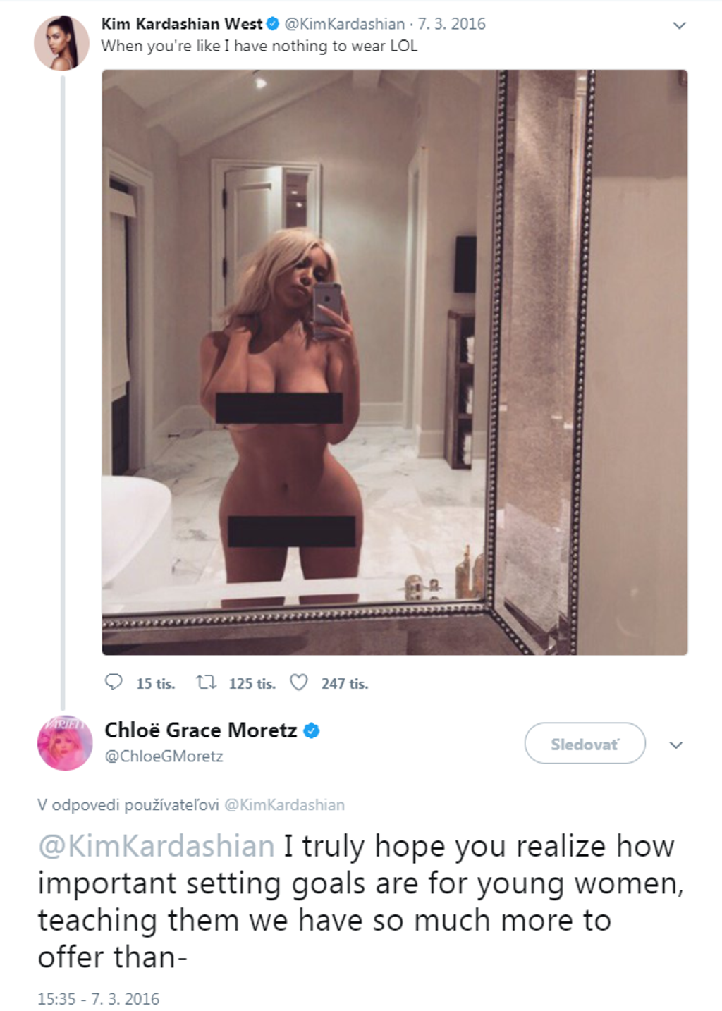 Reakcia na seba nenechala dlho čakať. "Všetci privítajme na Twitteri Chloë Grace Moretz, keďže nik vlastne nevie, kto to je," napísala uštipačne Kim. Nebolo to prvýkrát, čo sa do nej niekto "obul" pre veľké množstvo nahých fotiek, ktorými zásobuje svet. Tento incident sa stal už minulý rok.