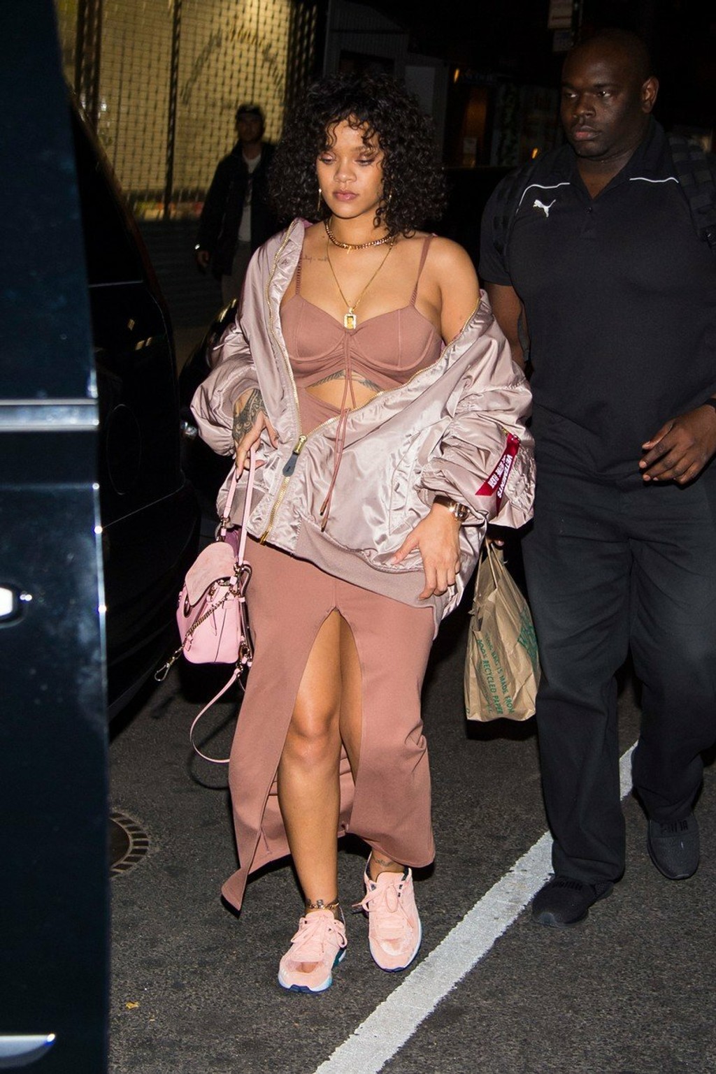 V šatách telovej farby s bundou zakrývajúcou jej brucho ju fotografi zachytili, ako opúšťa nahrávacie štúdio v New Yorku. Pre kilá navyše ju už začali mnohí podozrievať z toho, že je tehotná. Ale Rihanne asi začalo viac chutiť.