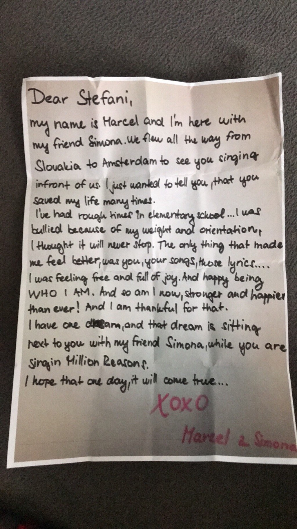 Na pódium jej Marcel hodil bundu s listom vo vrecku. Lady Gaga neváhala a obliekla si ju. Keď našla list, začala čítať. „Drahá Stefani, volám sa Marcel a som tu so svojou kamarátkou Simonou, leteli sme do Amsterdamu až zo Slovenska, aby sme ťa videli spievať,“ povedala, načo všetci začali tlieskať.