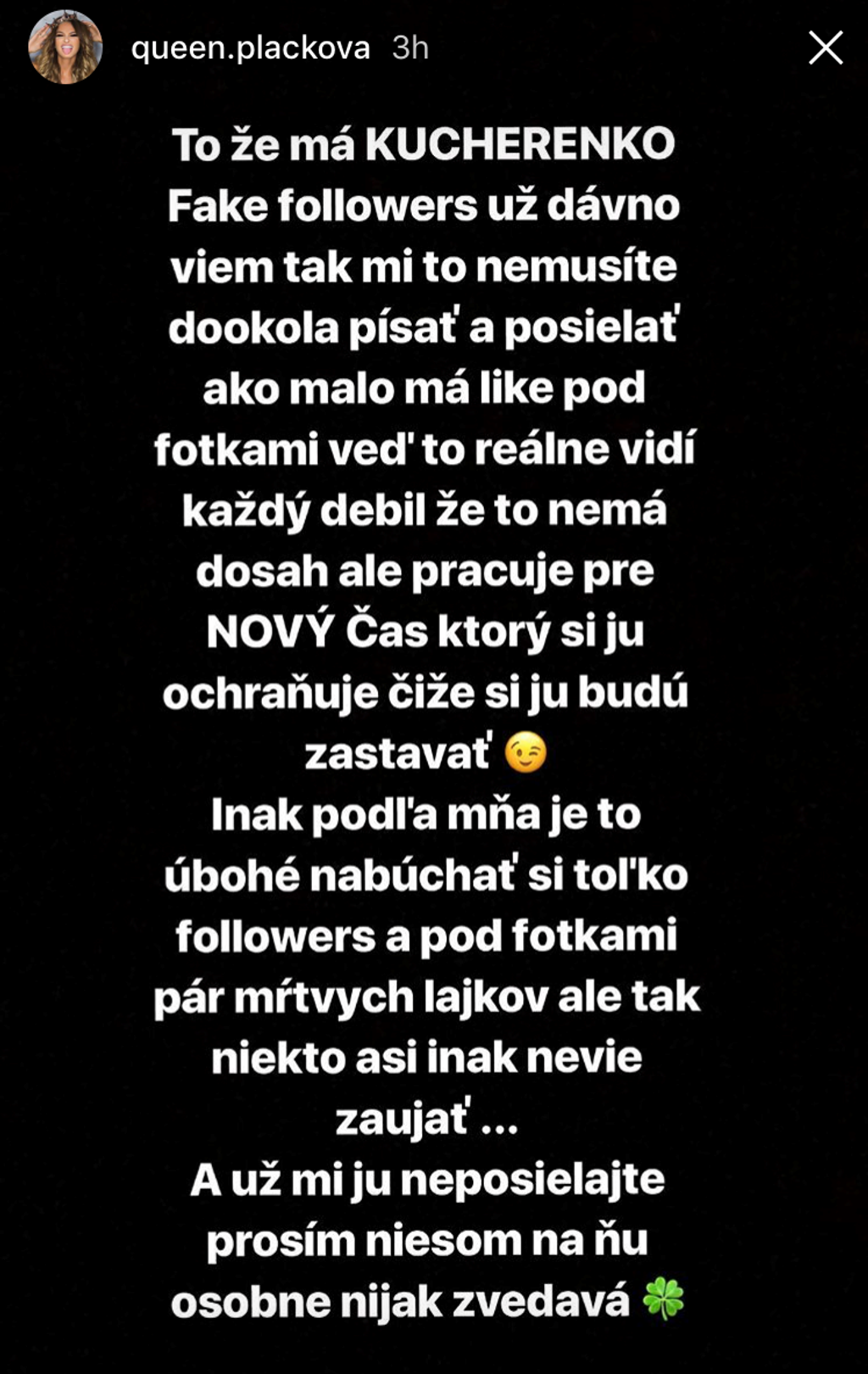 „To, že má Kucherenko fake followers, už dávno viem, tak mi to nemusíte dookola písať a posielať, ako málo má like pod fotkami, veď to reálne vidí každý, že to nemá dosah. Podľa mňa je to úbohé nabúchať si toľko followers a pod fotkami pár mrtvých lajkov, ale tak niekto asi inak nevie zaujať," napísala Plačková.
