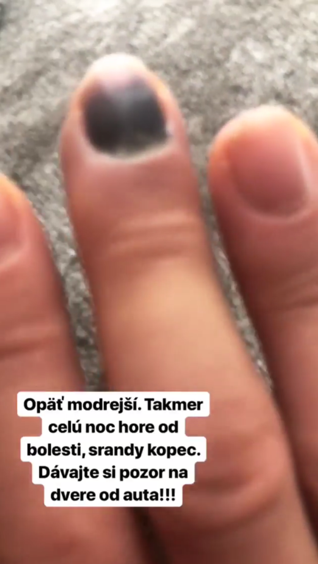 Redaktorka spravodajstva chcela fotkami upozorniť svojich fanúšikov na sociálnej sieti, aby si dávali pozor a nestalo sa im nič podobné. „Takmer celú noc hore od bolesti, srandy kopec. Dávajte si pozor na dvere od auta," napísala v Instastory.