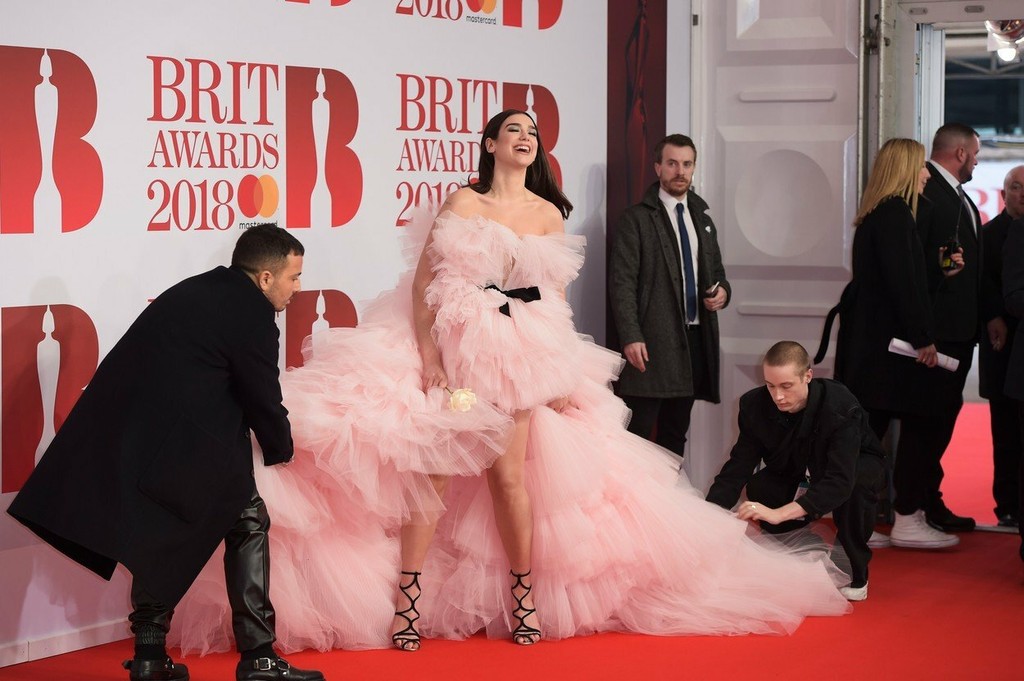 Dua Lipa (22) zasa prišla v ružových šatách s čiernou stuhou na páse, v ktorých vyzerala ako princezná. Keďže boli obrovských rozmerov, pomáhať jej museli dvaja asistenti.
