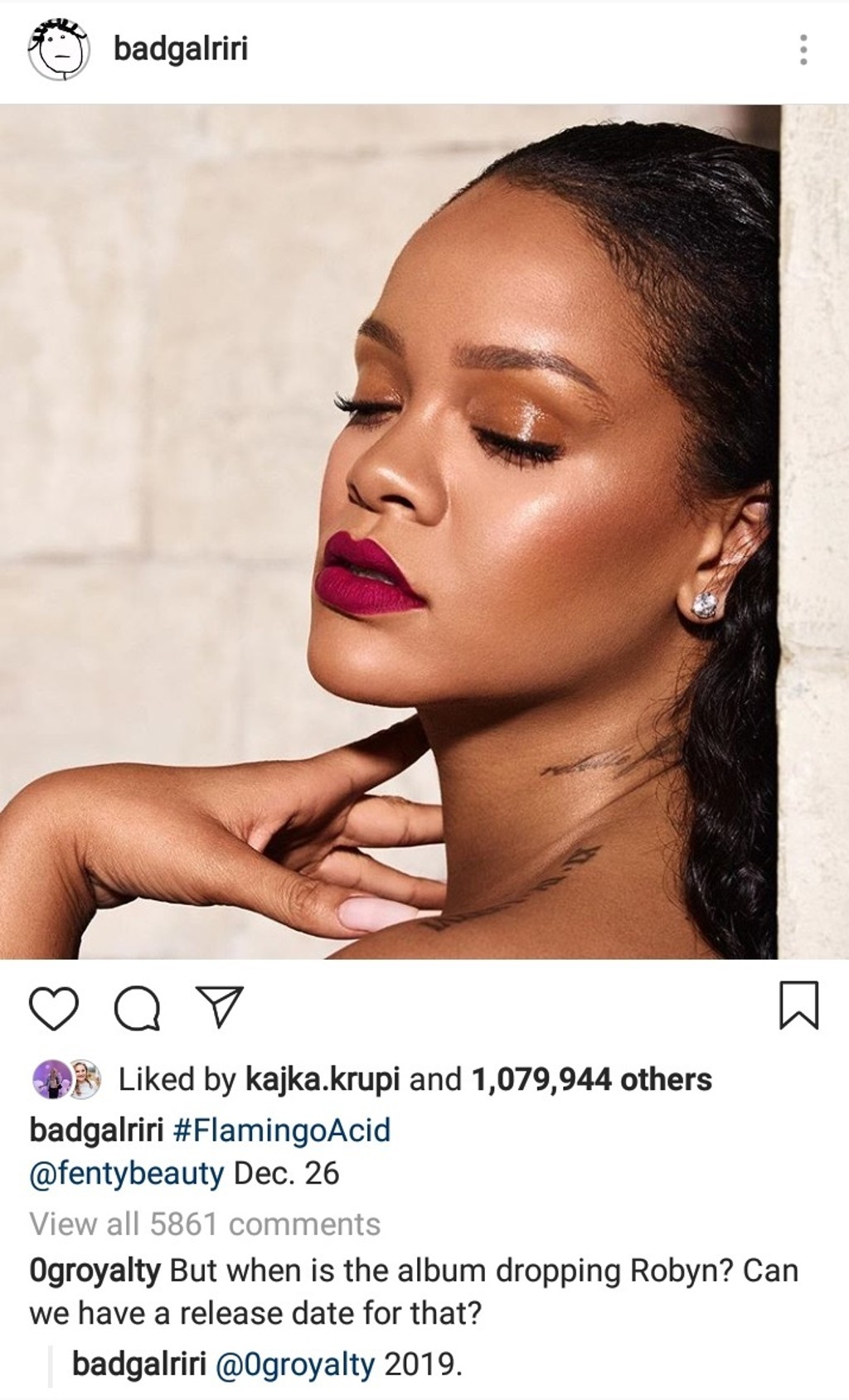 Barbadoská kráska sa však konečne odhodlala, a keď jej pod jednu z posledných fotiek napísala fanúšička: „Ale kedy už zverejníš nový album, Robyn? Môžeš nám dať dátum?“, odpísala iba „2019“.
