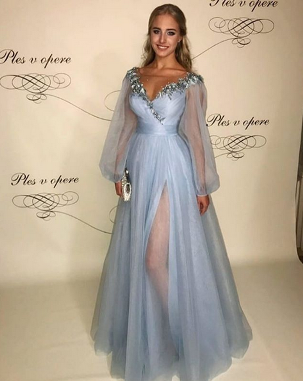 Sedemnásťročná sympatická slečna vyzerala v bledučko modrých šatách od Jany Jurčenko ako Popoluška.