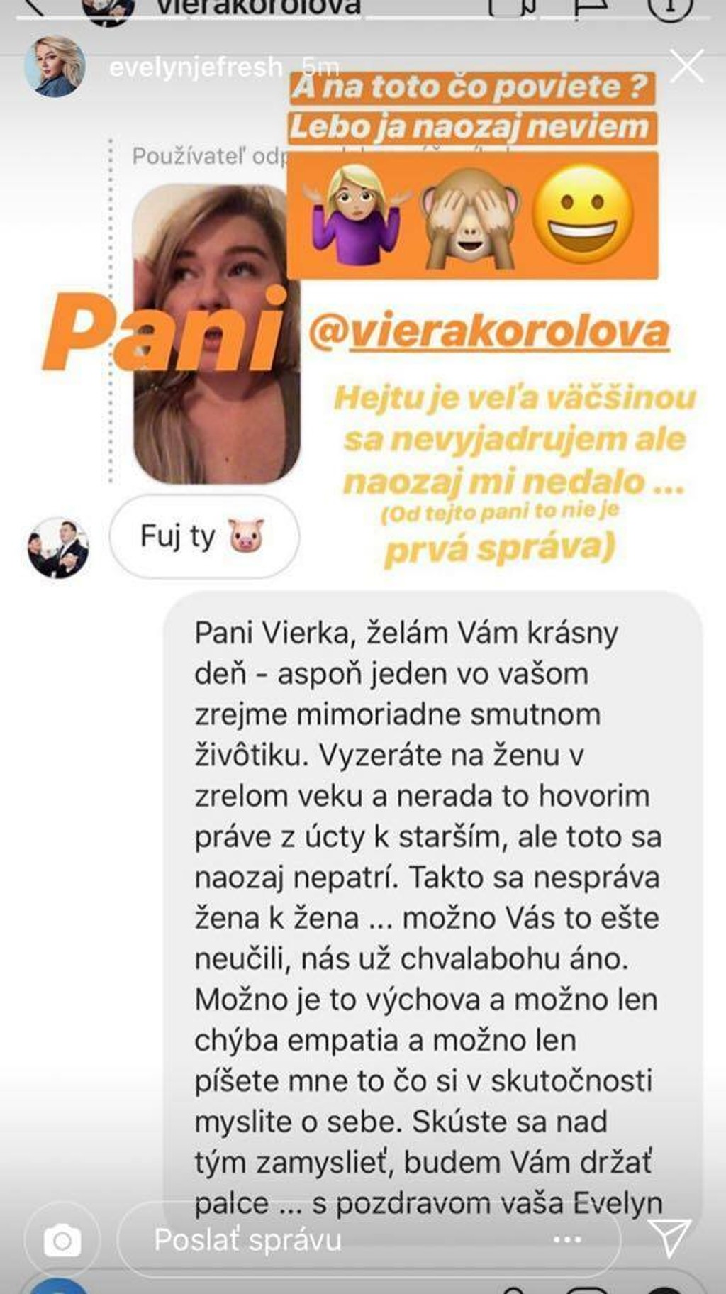 Evelyn zväčša na podobné správy nereaguje, no tentoraz sa rozhodla odpísať, pretože to nebola prvá správa s podobným kontextom. My jej reakcii tlieskame.
