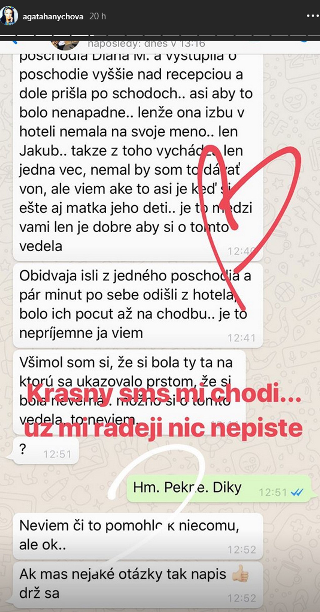 Herečka dostala zopár nemilých správ, v ktorých jej zamestnanec istého hotela opisuje, ako jej manžel mal stráviť noc so známou slovenskou herečkou. Jakub a Diana Mórová mali ráno vyjsť z jednej hotelovej izby a snažili sa to spraviť tak, aby si ich nikto nevšimol.