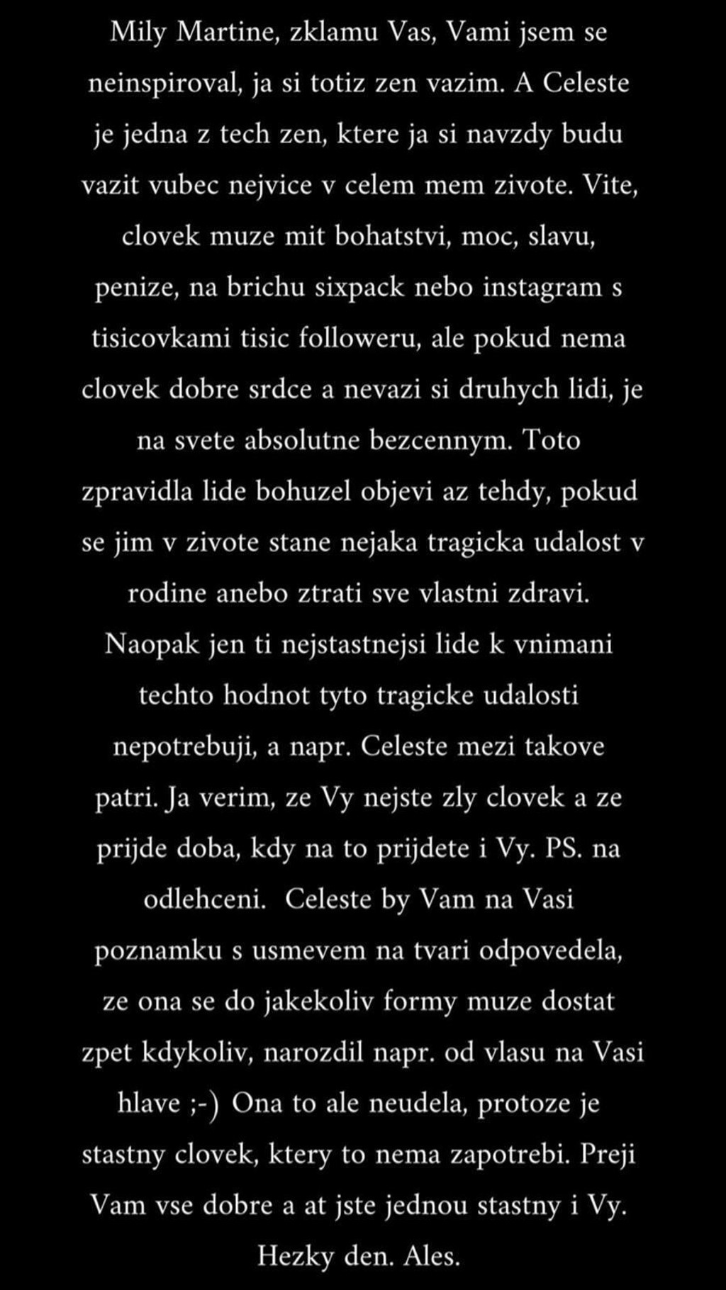 Okrem Celeste, ako takej, sa pustil aj do jej vzťahu s Alešom Mlátilikom. Podnikateľ na štipľavé poznámky verejne reagoval, no namiesto nadávok mu poprial všetko dobré do života, zaželal mu šťastie a dodal, že Celeste si bude pre to, aký je človek, vážiť do konca života.