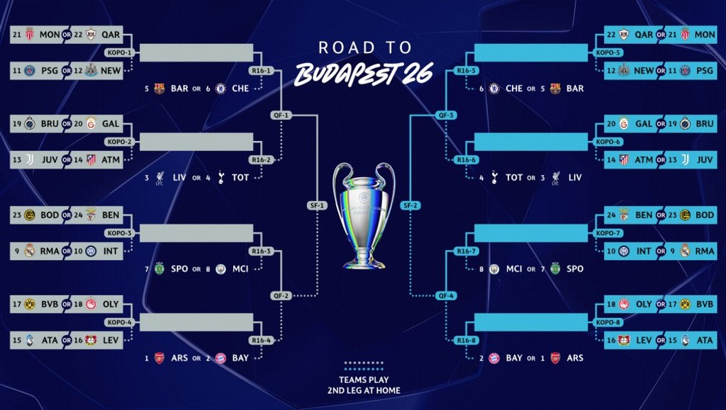 PSG obsadil v dlhodobej časti súťaže 11. priečku a spolu s dvanástym Newcastlom United mal medzi potenciálnymi súpermi okrem ligového konkurenta z Monaka aj azerbajdžanský FK Karabach. Real sa mohol stretnúť s nórskym FK Bodö/Glimt, napokon mu však žreb prisúdil Benfiku, pričom Nórov čaká neúspešný finalista uplynulého ročníka LM Inter Miláno.