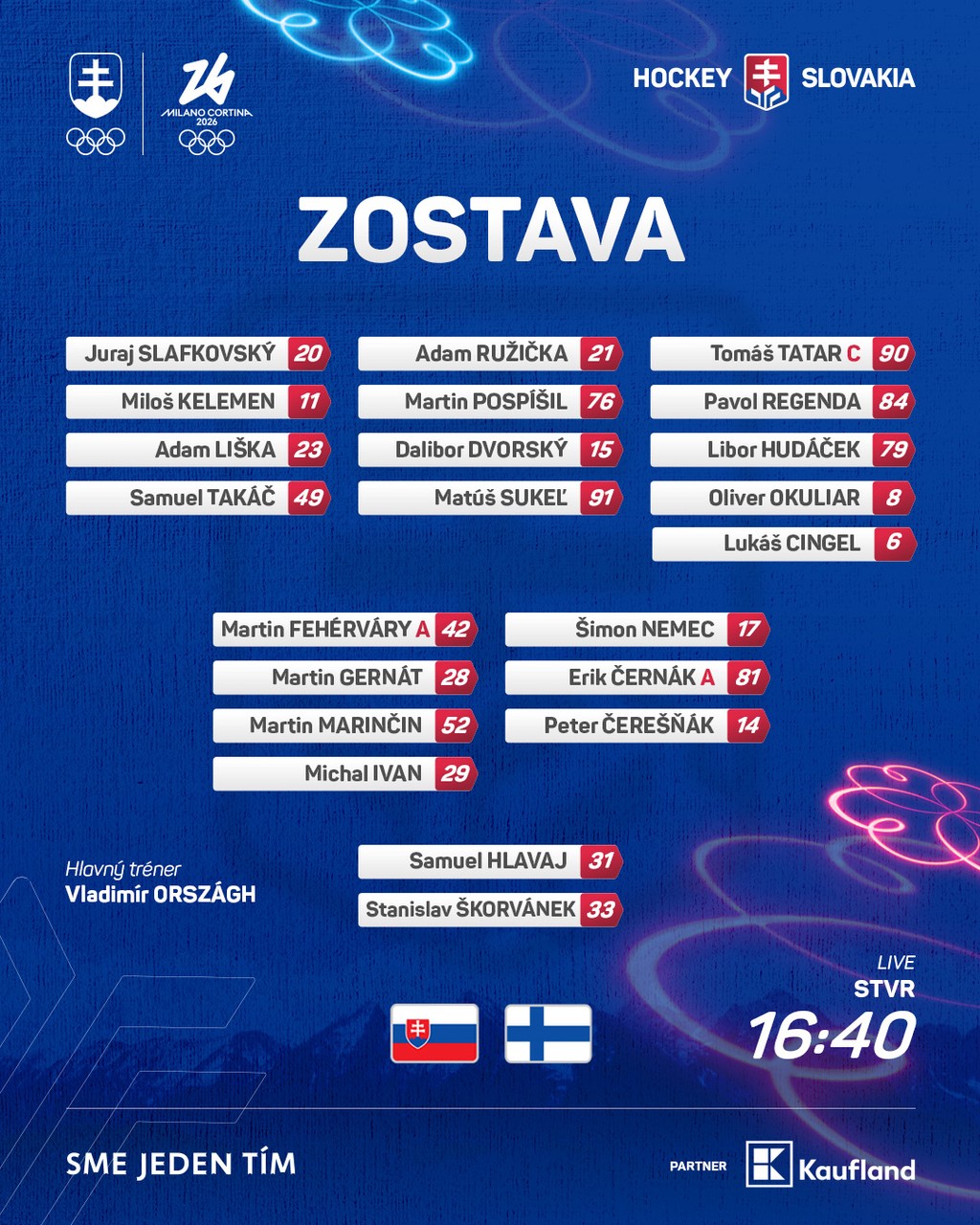 V prvom zápase sa do bránky postavil Samuel Hlavaj. Našou prvou údernou útočnou formáciou je trojica Juraj Slafkovský, Adam Ružička a Tomáš Tatar, ktorý má na drese kapitánske céčko.