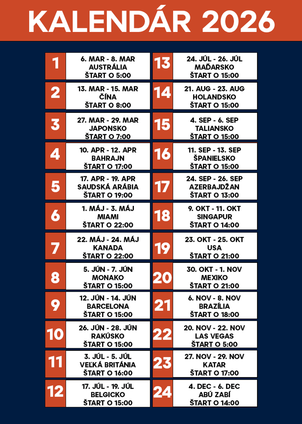 Kráľovná motoristického športu prichádza v novom šate, zaujímavé bude sledovať, ako sa jednotlivé tímy popasujú s novými pravidlami, ktoré vstupujú do platnosti od roku 2026. Podobne ako naposledy, aj tentoraz sa v kalendári sezóny nachádza celkovo 24 veľkých cien. Do programu ročníka ešte môže vstúpiť kríza na Blízkom východe, no aktuálne to vyzerá tak, že by preteky v Bahrajne či Saudskej Arábii nemali byť ohrozené. O všetkom sa však rozhodne až neskôr.