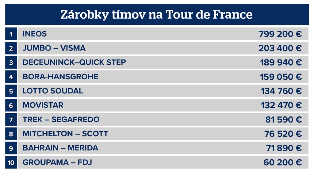 Z celkovej sumy takmer 2,3 milióna eur si najviac vďaka výkonom ukrojil tím Ineos. Dvaja jeho zástupcovia, Egan Bernal a Geraint Thomas, ovládli celkové poradie Tour