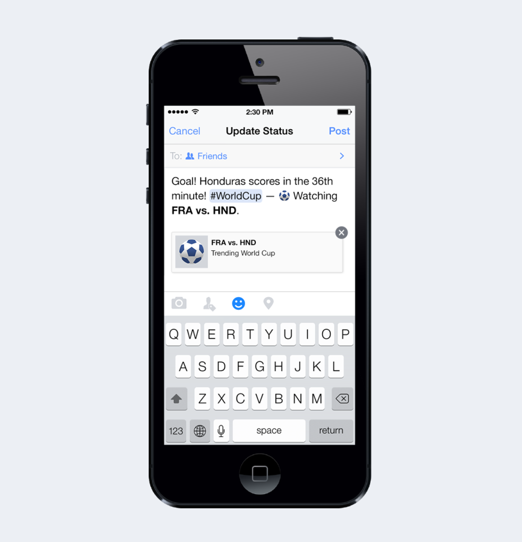 Ďalšou novinkou, ktorú plánuje Facebook spustiť vo štvrtok, je zdielanie zápasu, ktorý práve sledujete jednoducho cez mobilnú aplikáciu. Stačí kliknúť na ikonku „smajlíka" a zvoliť možnosť „watching".