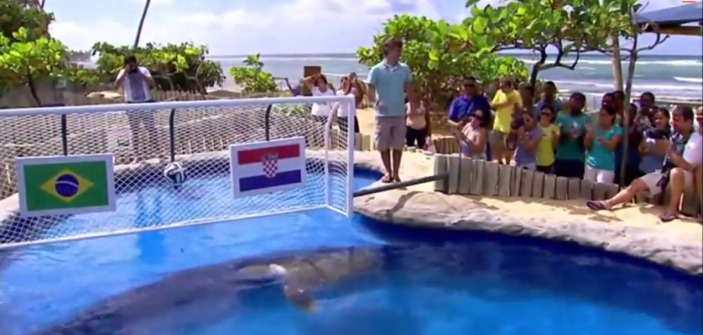 Korytnačka Veľká hlava tipovala výsledok súboja pri výbere z dvoch jedál označenými vlajkami Brazílie a Chorvátska. Rozhodla sa pre poživeň v brazílskych vlajkách. Jej výber ocenil menší dav divákov veľkým potleskom.