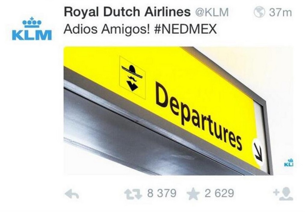 Hneď po nedeľňajšom víťazstve Holandska nad Mexikom 2:1 zverejnila holandská letecká spoločnosť na svojom účte na sociálnej sieti Twitter pozdrav "Adios Amigos!" Pri svetelnom nápise Odlety bol aj piktogramom Mexičana s typickým sombrerom a dlhými fúzmi.