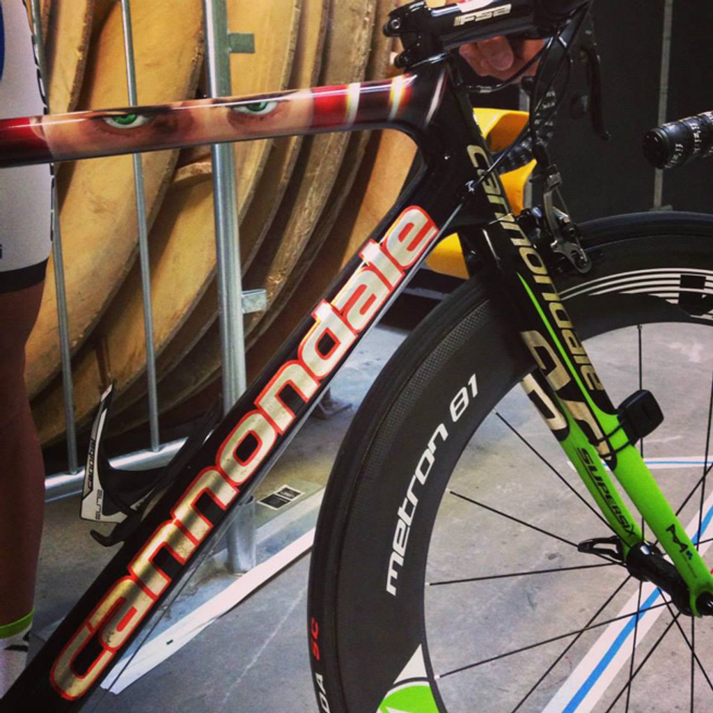 Bicyklu dominuje Saganova tvár so zelenými očami. "Náš tím jazdí v zelených dresoch, chcel by som zelené tričko, preto tento obraz,“ priznal pri prezentácii Sagan.