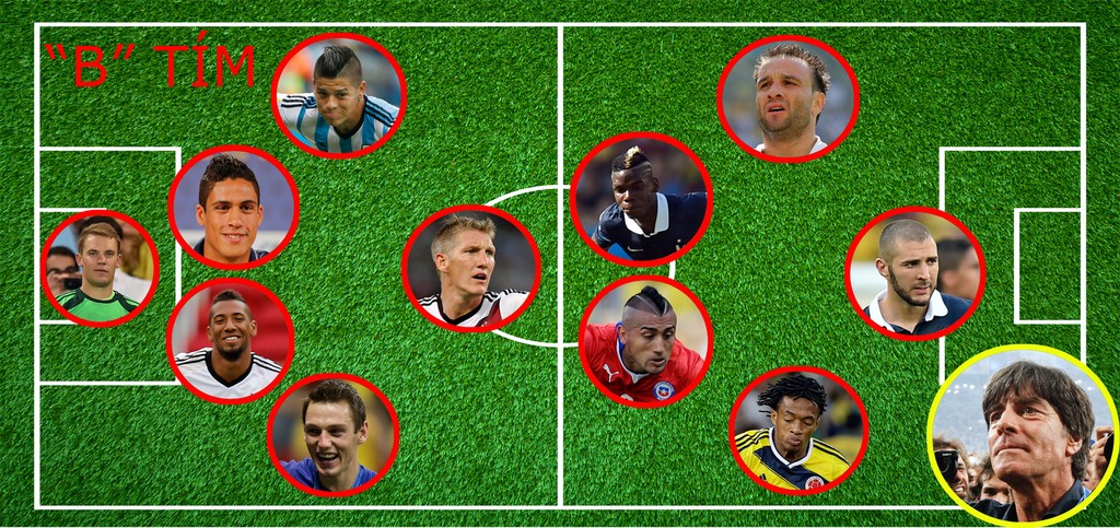Čo z Nemecka sa nezmestilo do „Áčka", to našlo uplatnenie v „Béčku". Držiteľa Zlatej rukavice Manuela Neuera dopĺňa stopér Jérôme Boateng a pilier v strede ihriska Bastian Schweinsteiger. Bohaté zastúpenie v našom „Béčku" má aj Francúzsko. Nechýba dvojica 21-ročných mladíkov Paul Pogba a Raphaël Varane, ktorá sa bila o cenu pre najlepšieho hráča narodeného po 1.1. 1993. FIFA ju napokon udelila stredopoliarovi.