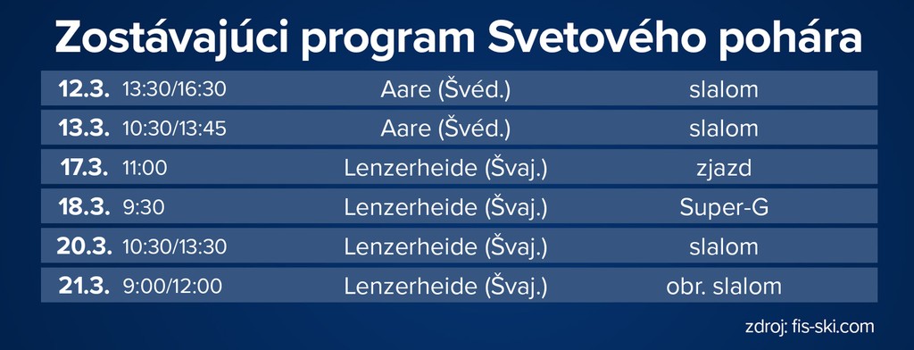 Budúci víkend sa pôjdu dva slalomy vo švédskom Aare a následne je v programe už len finále Svetového pohára v Lenzerheide. Vo švajčiarskom stredisku si zjazd, super-G, obrovský slalom a slalom dá už len 25 elitných pretekárok Svetového pohára a body za výkon dostane len najlepšia pätnástka.