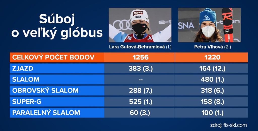 Momentálne je Vlhová druhá a na líderku Laru Gutovú-Behramiovú zo Švajčiarska stráca 36 bodov. Do konca sezóny zostáva šesť individuálnych pretekov - tri slalomy a po jednom obrovskom slalome, super-G a zjazde. V hre je tak ešte 600 bodov.