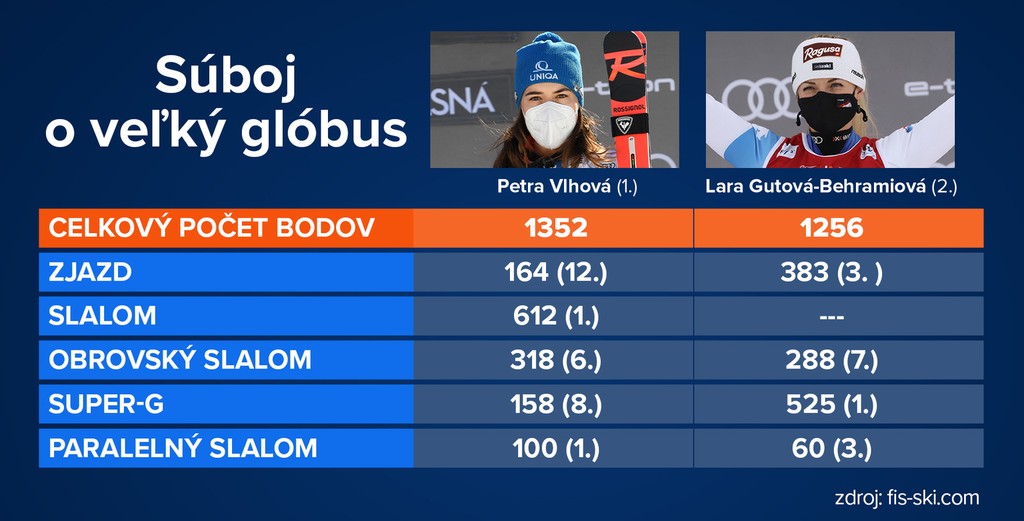 Hovorí sa však, že šanca zomiera posledná a preto treba brať do úvahy aj najčiernejší scenár. Ak by Vlhová vo svojich obľúbených disciplínach nezískala ani bod, čo si zrejme dokážu predstaviť asi iba najväčší pesimisti,a zároveň by obrovský slalom vyhrala Gutová-Behramiová, víťazkou by sa šokujúco stala "outsiderka" zo Švajčiarska.
