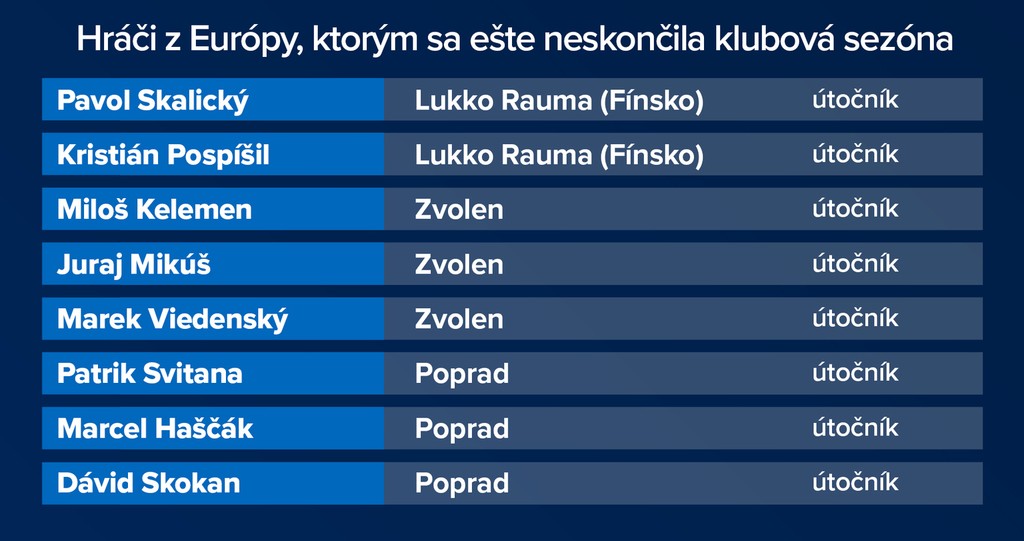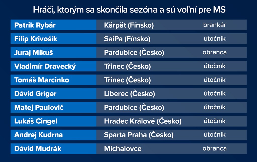 Naopak, do prípravy sa zapojí dvojica útočníkov švédskeho Leksandu Peter Cehlárik a Marek Hrivík, Michal Krištof z fínskeho Kärpät Oulu, Matúš Sukeľ zo Sparty Praha, brankári Matej Tomek (SaiPa/KalPa) a Július Hudáček (Spartak Moskva), útočník Michaloviec Pavol Regenda a dvojica čerstvých majstrov českej ligy v drese Třinca Miloš Roman a Patrik Hrehorčák. Ich spoluhráč obranca Martin Gernát a obranca českého vicemajstra z Liberca Mislav Rosandič sa k tímu pripoja v pondelok (3.5.).