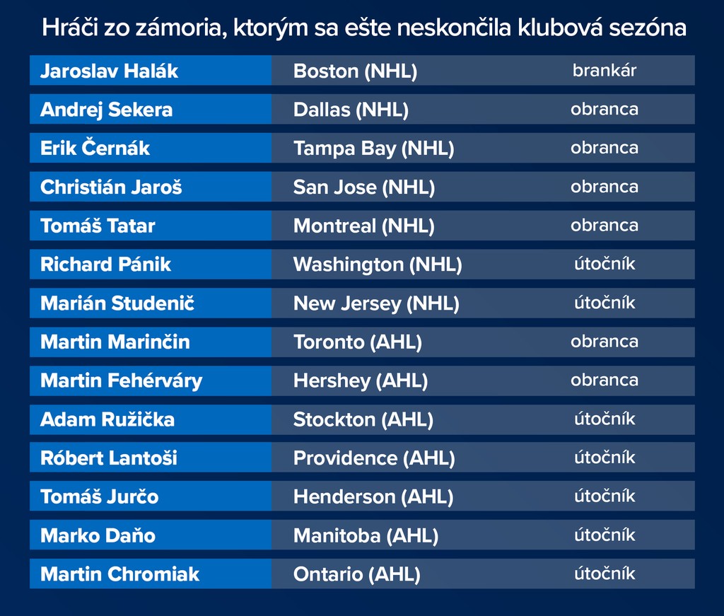 Na záver treba uviesť, že sme do zoznamu nezarátali Zdena Cháru a Tomáša Záborského. Žijúca a najmä stále hrajúca legenda NHL Chára má 44 rokov a je nepravdepodobné, že by po vypadnutí s Washingtonom pokračoval v sezóne. Záborský, dlhoročný účastník fínskej Liigy, dávnejšie ukončil reprezentačnú kariéru.