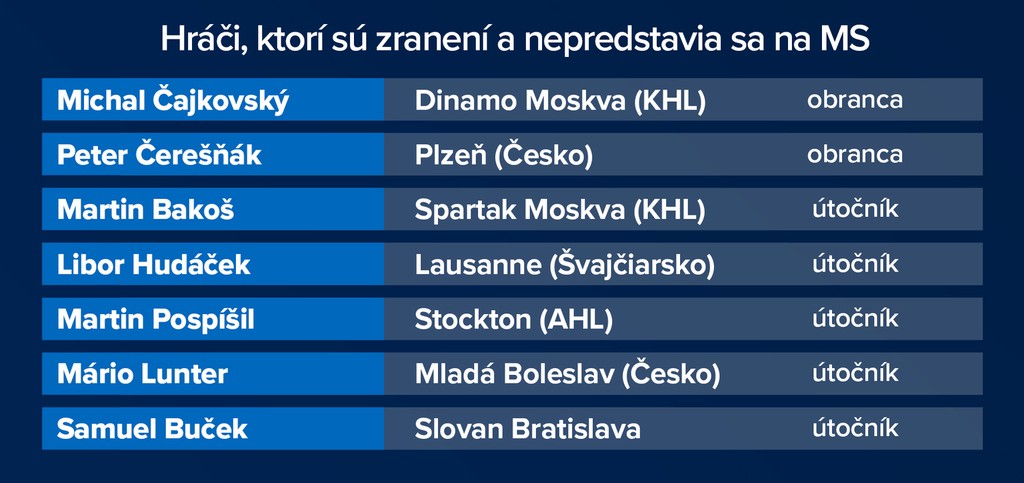 Žiaľ, už tradične viacerých hráčov vyradilo z boja o turnaj zranenie. Ide o dvojicu z KHL - Michal Čajkovský a Martin Bakoš, platí to aj v prípade mladého útočníka Martina Pospíšila z AHL.