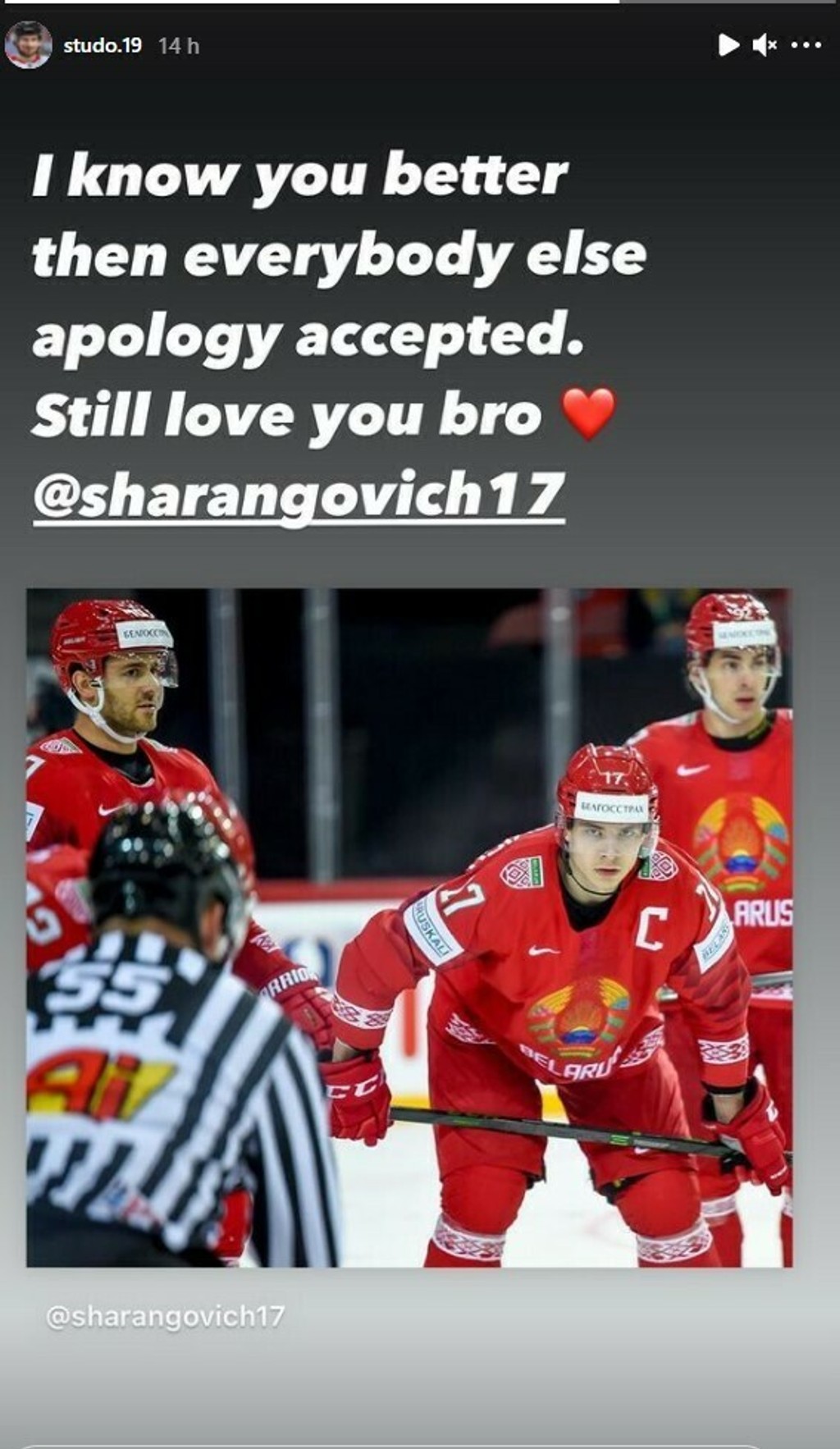 "V piatkovom zápase proti Slovensku moja frustrácia rezultovala v hanebný a nezodpovedný čin smerom k súperovej striedačke. Neexistuje ospravedlnenie na to, ako som sa správal a cítim sa za to trápne," napísal na svojom instagramovom profile kapitán bieloruskej reprezentácie.