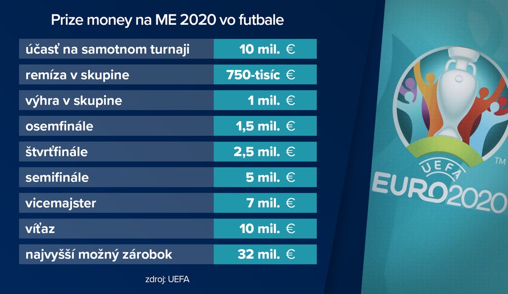 Ako píše web Totalsport, už za samotný postup na záverečný turnaj zinkasuje každý z 24 účastníkov odmenu vo výške 10 miliónov eur. Za tri duely v základnej skupine si každé mužstvo môže prísť najviac na tri milióny. Za víťazstvo je prize money na úrovni jedného milióna, v prípade remízy tím zarobí 750-tisíc.