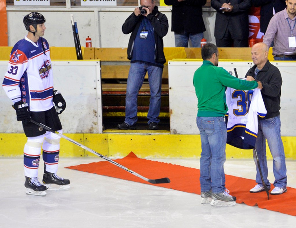 Úvodné buly trenčianskej exhibície vhodil medzi hokejky Zdena Cháru a Kellyho Chasea Demitrov otec Pavol. Následne si z rúk kapitána St. Louis prevzal hokejku, s ktorou jeho syn zaznamenal pred niekoľkými rokmi v drese "bluesmanov" víťazný gól v stretnutí a daroval ju fanúšikovi. Ten vyhľadal predstaviteľov projektu Alumni, aby ju práve pri tejto príležitosti odovzdali Pavlovi Demitrovi staršiemu.