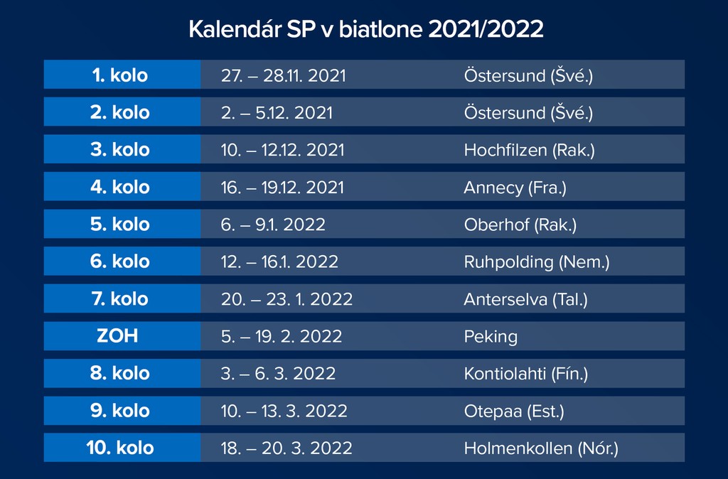 Počas celej sezóny biatlonisti a biatlonistky absolvujú celkovo 10 kôl svetového pohára. Najdlhšia prestávka medzi jednotlivými kolami bude vo februári, keď sú na programe ZOH v Pekingu. Jedným z hlavných cieľov slovenskej reprezentácie v seriáli SP bude získať miestenky v štafetových pretekoch na zimnej olympiáde.