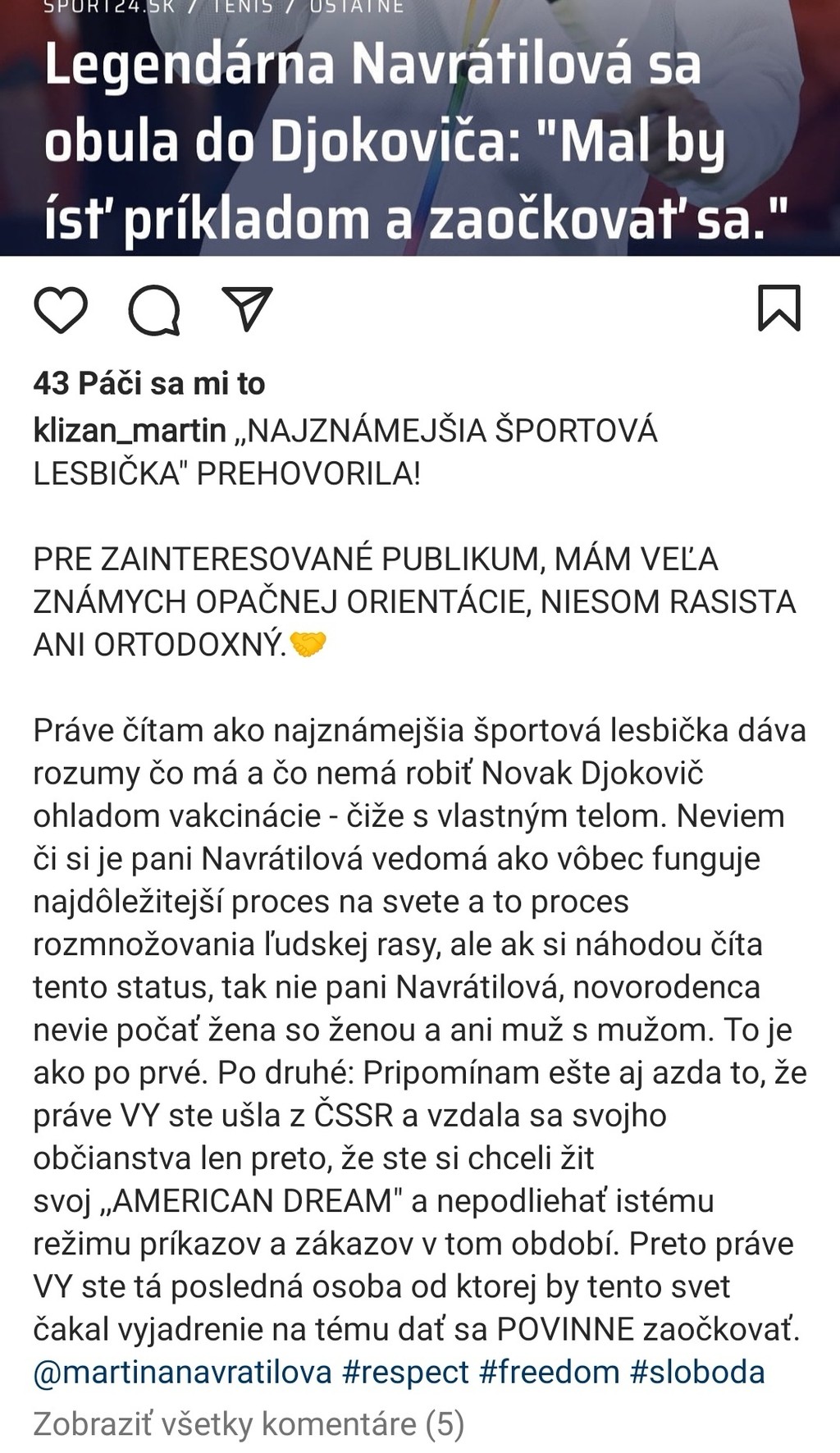 „Práve čítam, ako najznámejšia športová lesbička dáva rozumy, čo má a čo nemá robiť Novak Djokovič ohľadom vakcinácie - čiže s vlastným telom. Neviem či si je pani Navrátilová vedomá ako vôbec funguje najdôležitejší proces na svete, a to proces rozmnožovania ľudskej rasy, ale ak si náhodou číta tento status, tak nie, pani Navrátilová, novorodenca nevie počať žena so ženou a ani muž s mužom,“ napísal niekdajší 24. hráč sveta Kližan.