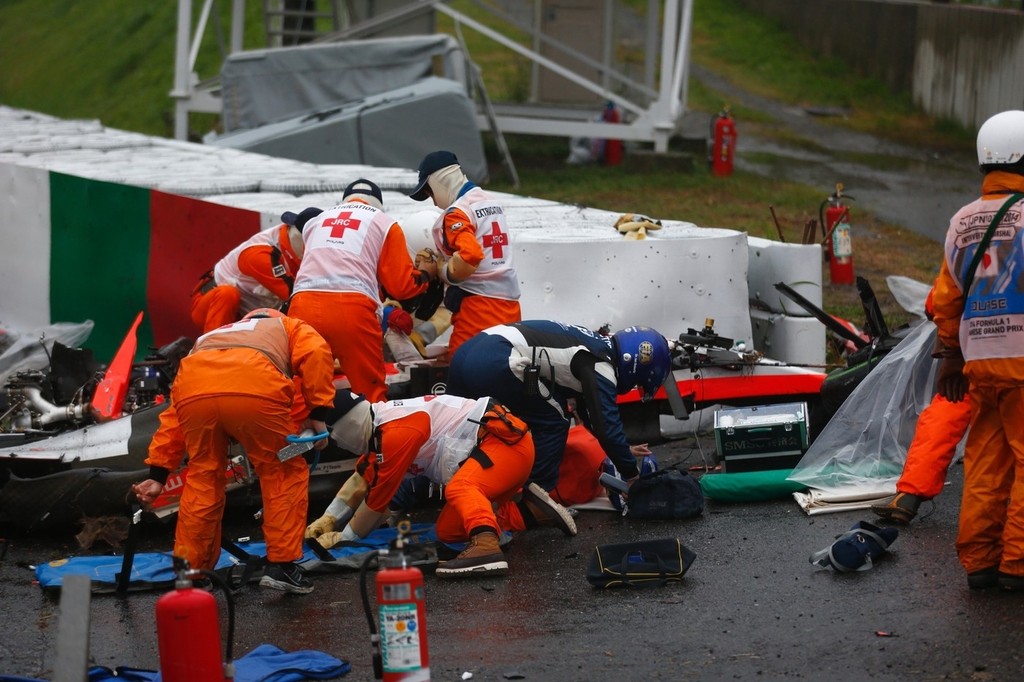 Dvadsaťpäťročný Francúz v nedeľu nešťastne narazil do žeriavu, ktorý odpratával monopost Nemca Adriana Sutila. Ten havaroval v nepríjemnej zákrute Dunlop krátko predtým, ako priestorom prechádzal Bianchi. Po havárii bol v bezvedomí, pre zlé počasie ho však nemohli transportovať do nemocnice helikoptérou, takže ho musela previezť sanitka s policajným sprievodom.