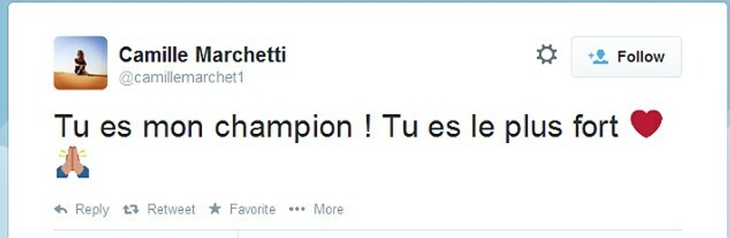 Priateľka pretekára F1 Julesa Bianchiho vyslala včera cez Twitter modlitbu pre svojho „šampióna", keď bojoval o život v japonskej nemocnici. Študentka Camille Marchetti (24), ktorá je po boku pretekára už dlhší čas, napísala: „ Ty si môj majster, ty si najsilnejší". Správu ukončila emotívnym znakom srdca a rukami, ktoré sú zomknuté v modlitbe.