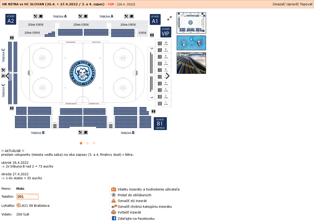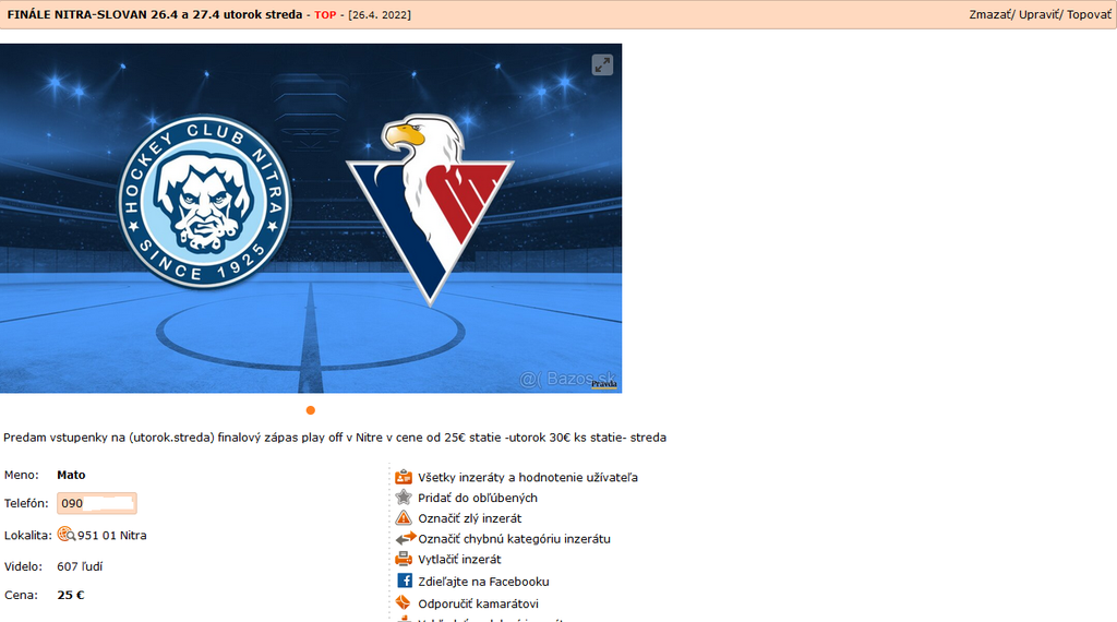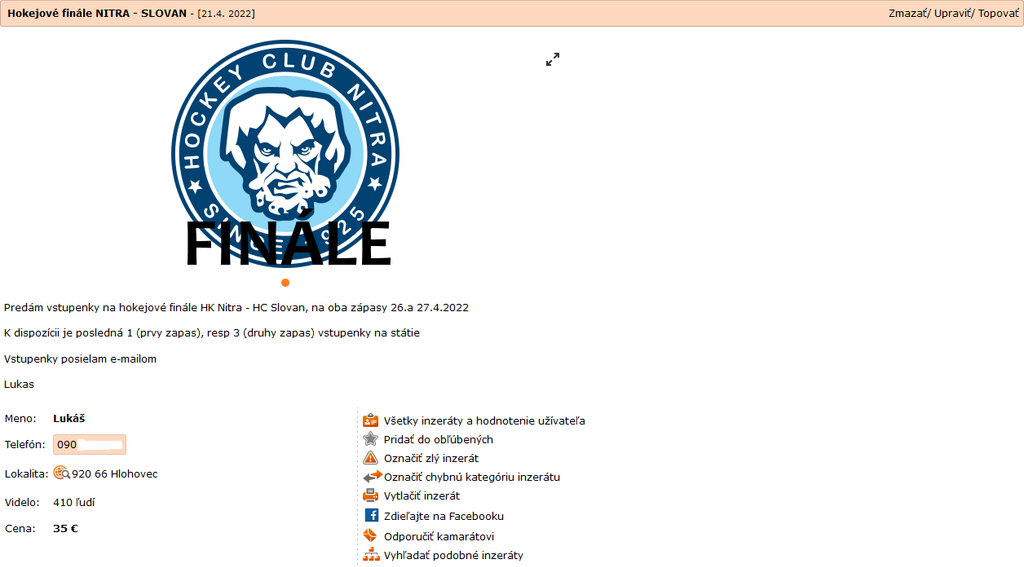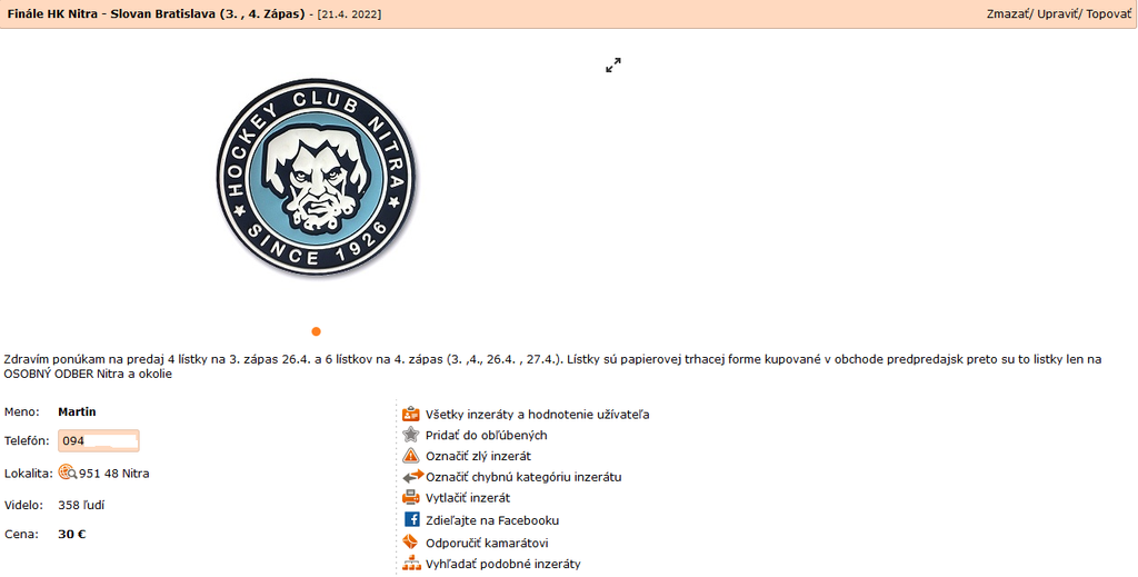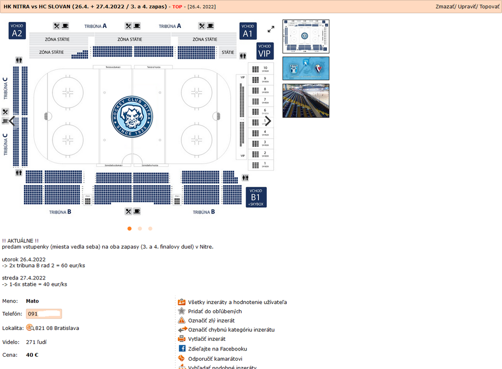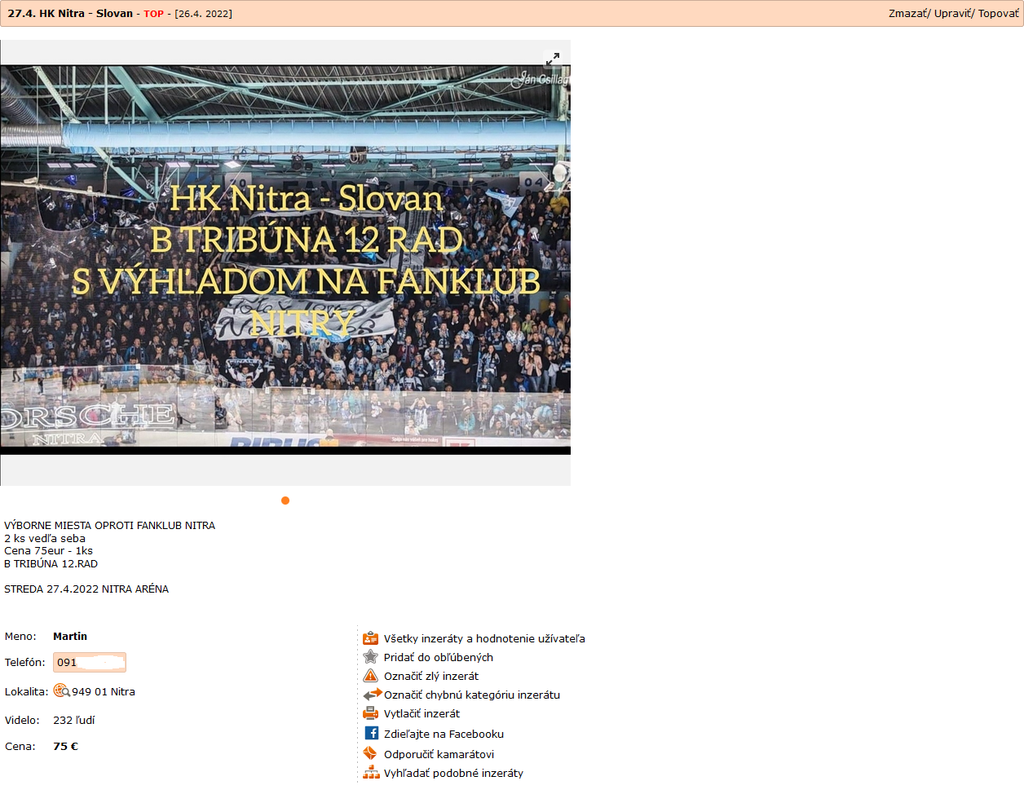 Zarobiť na finále zrejme túži aj Martin z Nitry. Ten v inzeráte uvádza, že má k dispozícii na stredu dva lístky na sedenie do sektoru B, rad č. 12. Ako podotkol, ide o „výborné miesta oproti fanklubu Nitry“. Za jeden z tohto dôvodu požaduje 75 eur, teda ide o viac stopercentné navýšenie.