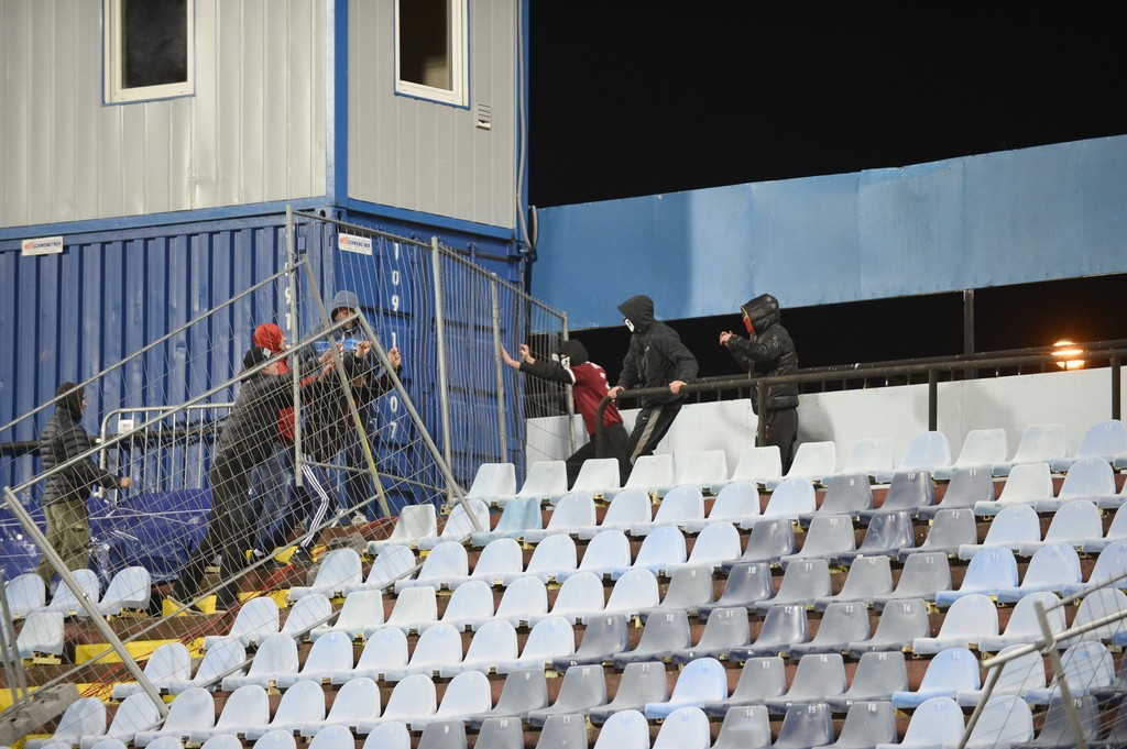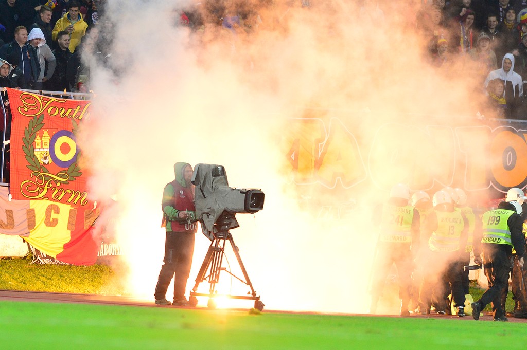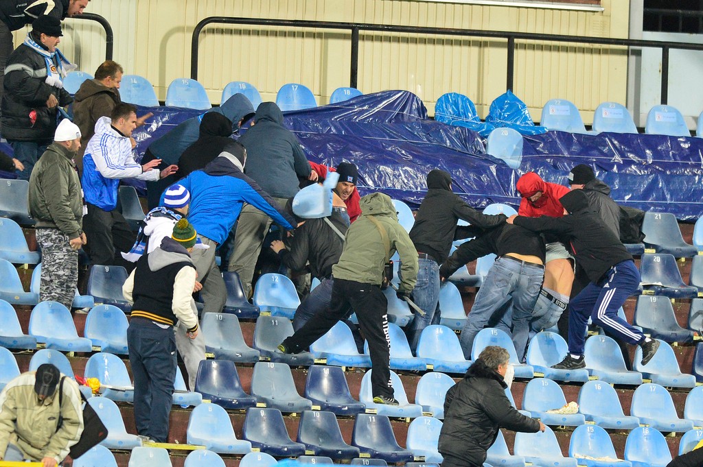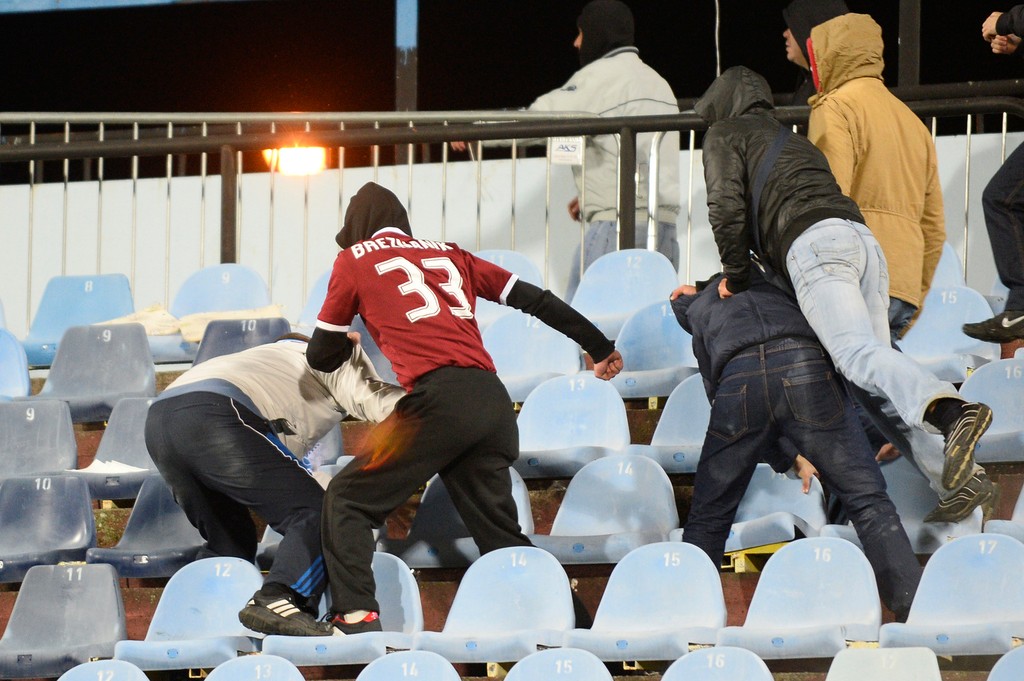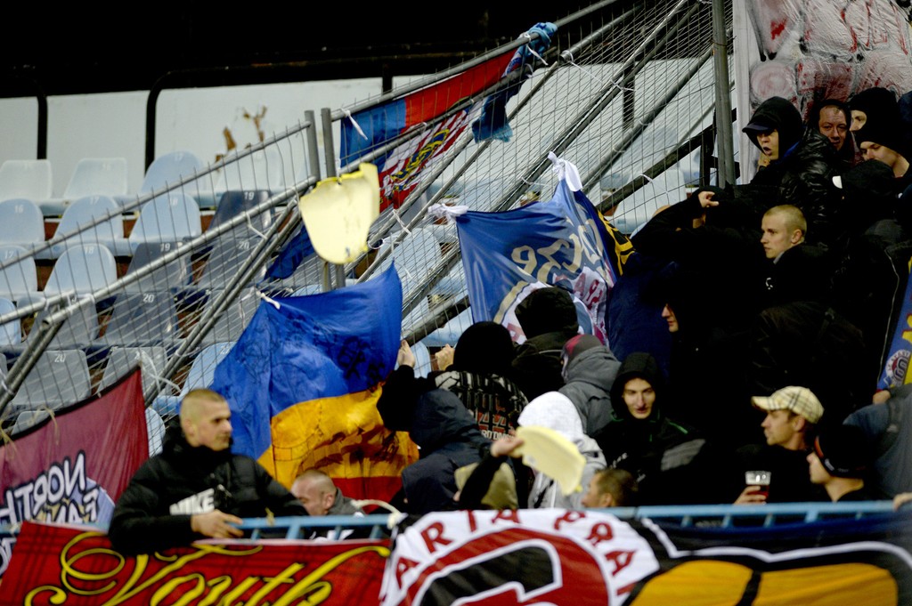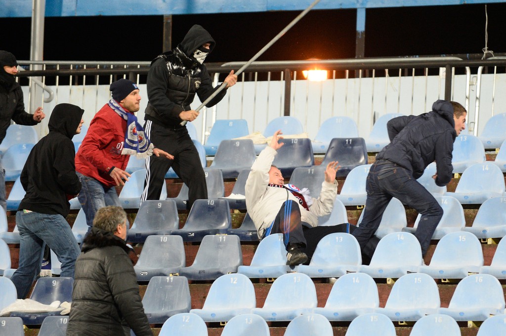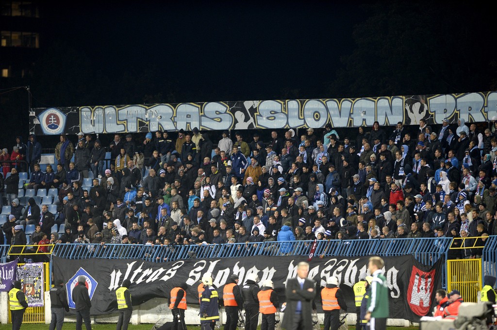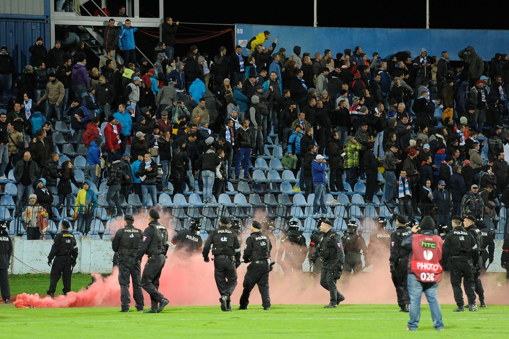 Zápas Slovan Bratislava - Sparta Praha museli pre výtržnosti fanúšikov na pol hodinu prerušiť.