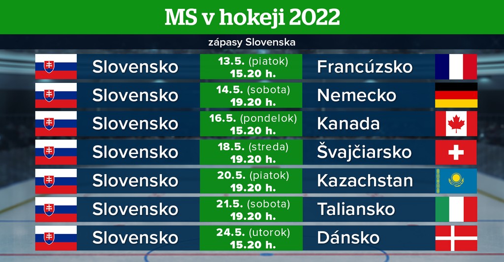 Slovenskí hokejoví reprezentanti nastúpia vo svojom úvodnom zápase proti Francúzom. Duel je na programe v otvárací deň turnaja, v piatok 13. mája o 15:20. Následne na našich čakajú v A skupine ešte Nemecko, Kanada, Švajčiarsko, Kazachstan, Taliansko a Dánsko. V B skupine sa zase predstaví Česko, Fínsko, USA, Švédsko, Lotyšsko, Nórsko, Veľká Británia a Rakúsko.
