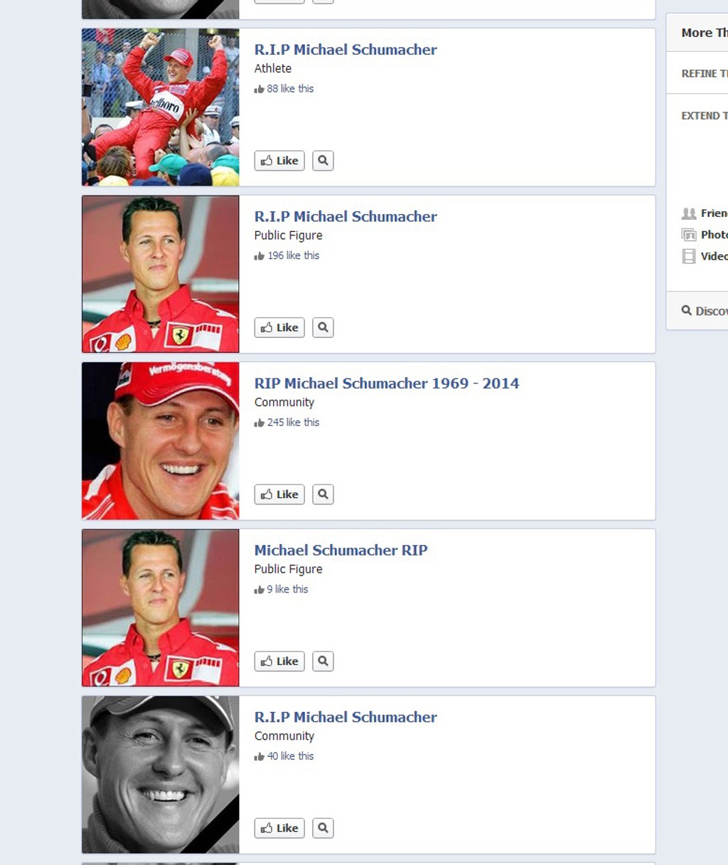 Znie ale až neuveriteľne, že sa našli aj takí, ktorí hviezdu pochovali. Na Facebooku už vzniklo niekoľko skupín s názvom R.I.P. Michael Schumacher. Niektoré majú viac ako 20-tisíc fanúšikov.