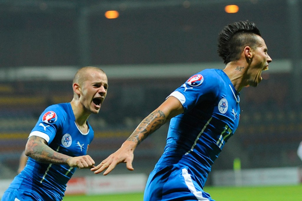 stredopoliari: Viktor Pečovský (MŠK Žilina), Ján Greguš (FK Jablonec), Juraj Kucka (FC Janov), Patrik Hrošovský (Viktoria Plzeň), Ondrej Duda (Legia Varšava), Stanislav Šesták (VfL Bochum), Marek Hamšík (SSC Neapol), Vladimír Weiss (Lekhwiya SC), Róbert Mak (PAOK Solún), Miroslav Stoch (Al-Ain FC)