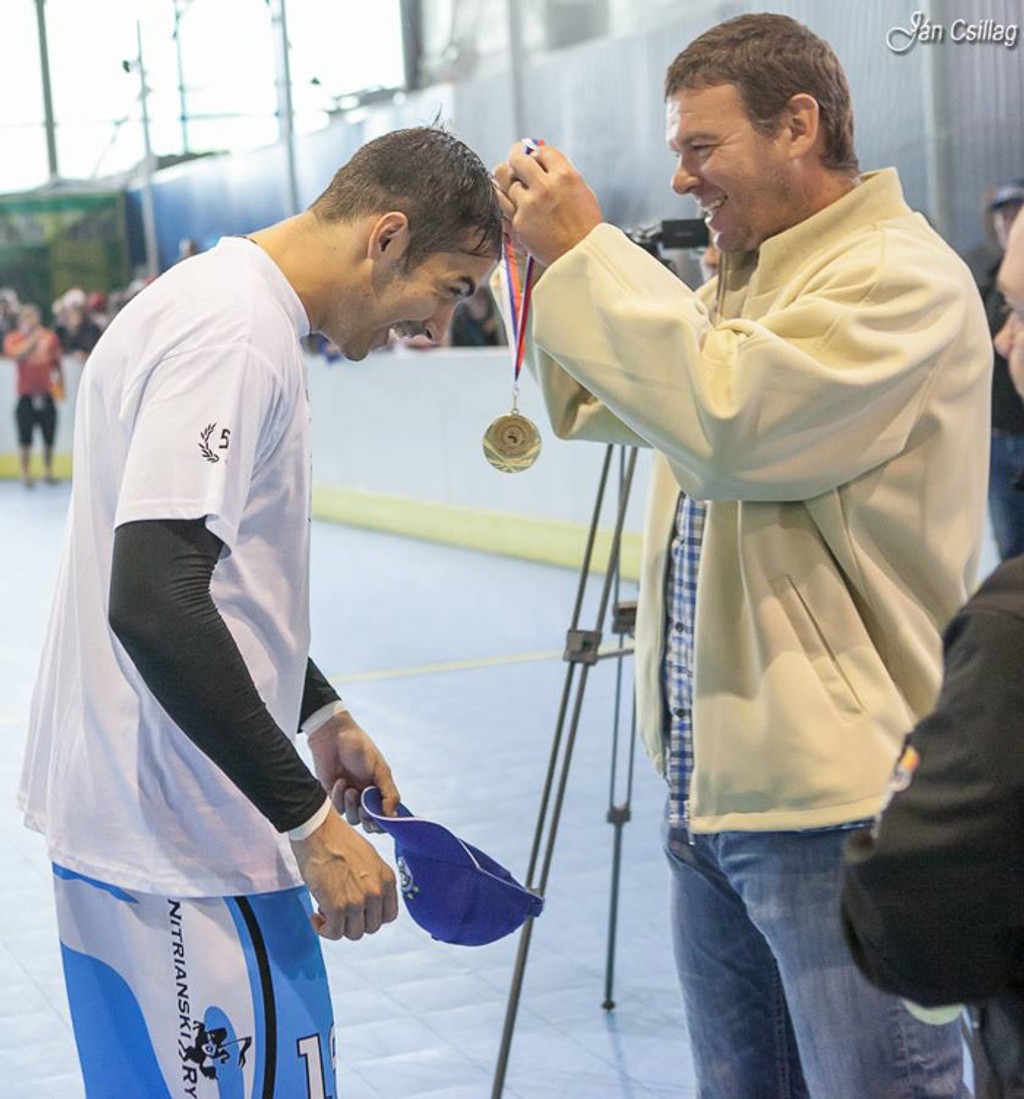 Trofej staronovým majstrom prišiel odovzdať osobne prezident slovenskej hokejbalovej únie Jozef Stümpel.