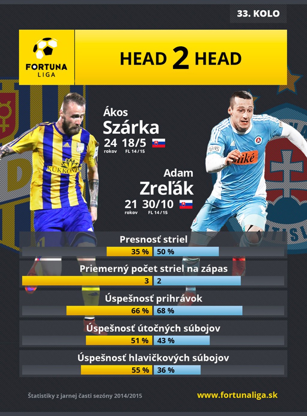 Šesť sobotňajších duelov 33. kola so začiatkom o 17.15 h uzavrie fortunaligovú sezónu 2014/2015. O všetkom dôležitom však rozhodli už uplynulé konfrontácie, v ktorých si majstrovský primát vybojoval premiérovo AS Trenčín, účasť v Európskej lige UEFA 2015/2016 MŠK Žilina, Spartak Trnava i Slovan Bratislava a s najvyššou domácou súťažou sa rozlúčili vzhľadom na tabuľkovú matematiku futbalisti Dukly Banská Bystrica.