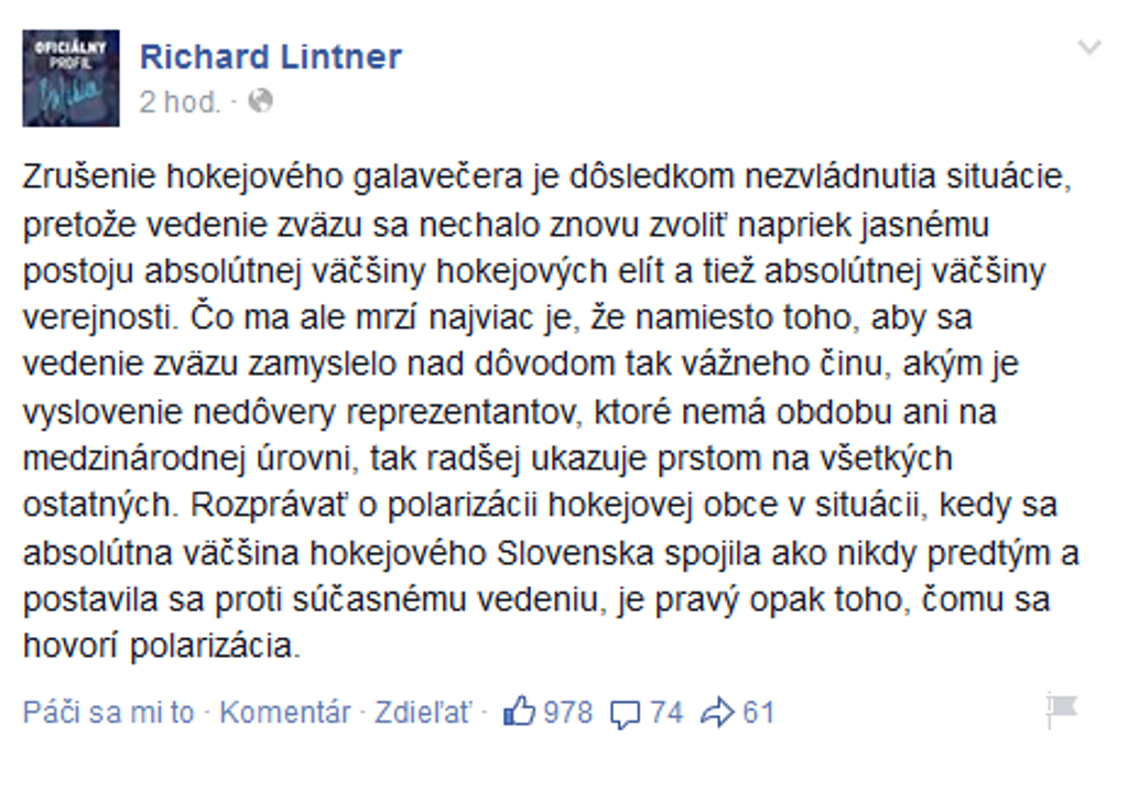 "Toto rozhodovanie nebolo ľahké, ale rozhodli sme sa, že chceme hokej spájať a nie deliť. Pokiaľ niektorí hráči verejne deklarujú, že na slávnosť neprídu, rešpektujeme to, je to ich rozhodnutie. Ľúto nám je predovšetkým fanúšikov, pre ktorých mal byť tento galavečer uskutočnený. Rozhodli sme sa financie rozdeliť mládežníckym klubom. Ocenenia samozrejme víťazom doručíme," cituje oficiálny web SZĽH slová generálneho sekretára Róberta Pukaloviča.