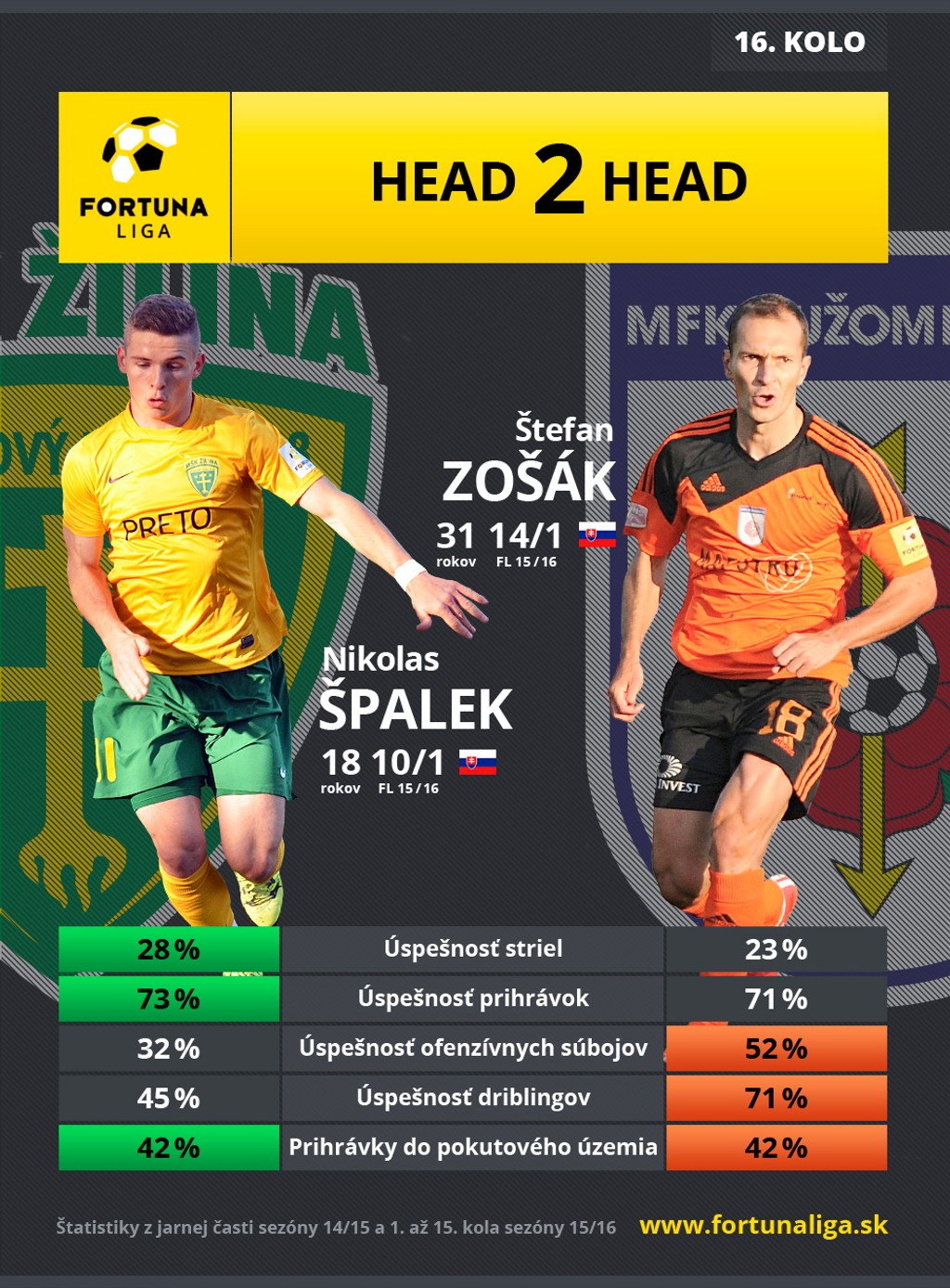 Derby sa bude hrať v Žiline, kde sa na pôde tretieho tímu tabuľky predstaví ôsmy Ružomberok. Otázne je, či tréner domácich Adrián Guľa môže počítať s kapitánom Viktorom Pečovským, ktorý si v pohárovom zápase na pôde Vyšného Opátskeho (4:1) zranil sval. Zápas si môžete pozrieť aj na stanici Dajto. Priamy prenos sa začína v sobotu (7.11.) o 18.05 hod.