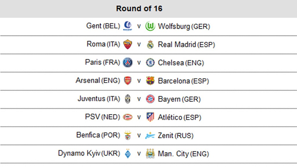 Podľa pravidiel LM sa v prvej fáze jarnej vyraďovacej fázy nemohli stretnúť kluby z rovnakej skupiny či krajiny, ani kluby z Ukrajiny a Ruska, v tomto prípade Zenit Petrohrad s Dynamom Kyjev. Víťazi skupín mali privilégium, že figurovali medzi nasadenými mužstvami a prvý zápas odohrajú na ihrisku súpera.