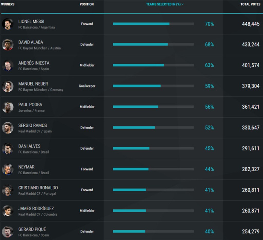 Manuel Neuer (Bayern Mníchov/Nem.) - David Alaba (Bayern Mníchov/Rak.), Sergio Ramos (Real Madrid/Šp.), Dani Alves (FC Barcelona/Braz.), Gerard Pique (FC Barcelona/Šp.) - Andres Iniesta (FC Barcelona/Šp.), Paul Pogba (Juventus Turín/Fr.), James Rodriguez (Real Madrid/Kol.) - Lionel Messi (FC Barcelona/Arg.), Neymar (FC Barcelona/Braz.), Cristiano Ronaldo (Real Madrid/Port.)