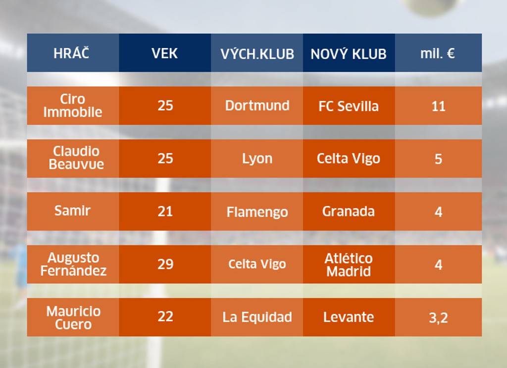 Oba madridské kluby Real aj Atlético majú pre porušenie pravidiel FIFA ohľadom registrácie neplnoletých hráčov zákaz podpisovať nových hráčov do leta 2017, Barcelone trest vypršal v januári tohto roka. Najdrahším hráčom v rámci príchodov do La Ligy sa tak stal 25-ročný Ciro Immobile. Taliansky reprezentant prišiel do FC Sevilla z nemeckého Dortmundu, do pokladne vestfálskeho tímu pribudne 11 miliónov eur. Immobile však napokon aktuálnu sezónu dohrá v FC Turín, kde hrával pred presunom do Nemecka.