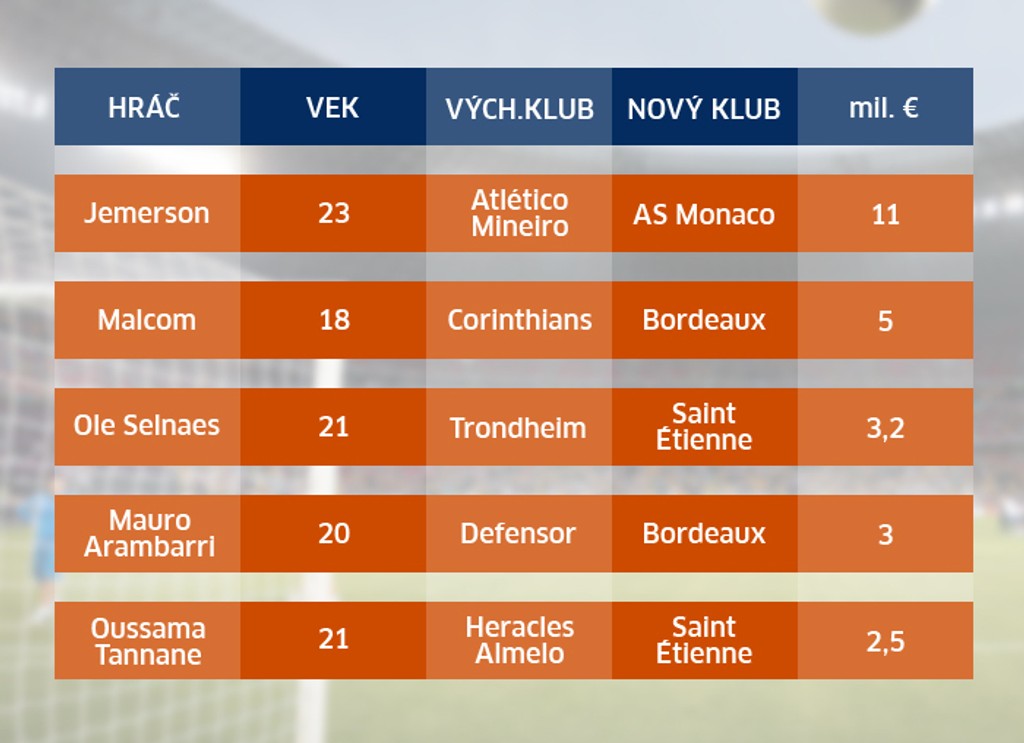 Počas tohto prestupového obdobia v rámci európskej veľkej päťky líg (anglická, španielska, nemecká, talianska a francúzska) bolo práve to francúzske najslabšie. Suverén tamojšej Ligue 1 Paríž St. Germain káder nijako nemenil, v tabuľke druhé AS Monaco uskutočnilo najdrahší prestup tejto zimy, keď za 11 miliónov eur dotiahlo do tímu 23-ročného brazílskeho beka Jemersona z Altética Mineiro.