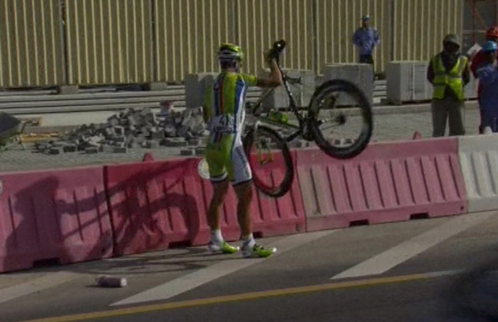 Televízne zábery ukázali, ako v hneve odhodil svoj bicykel do ochranných bariér.